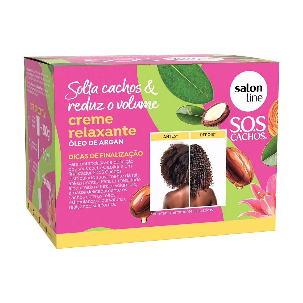 O Creme Relaxante S.O.S Cachos Solta Cachos & Reduz o Volume promove soltura a curvatura, reduz o volume e controla o frizz sem abrir mão do movimento natural. Indicado para cabelos crespos, cacheados, volumosos ou sem definição, garante fios nutridos, alinhados e radiantes. <>INDICAÇÕES$& Para quais tipos de cabelo? Para cabelos crespos e cacheados. Qual a indicação? Para cabelos volumosos e sem definição Pode usar a partir de quantos anos? A partir de 12 anos. <>ATIVOS$& Quais os principais ativos? Todos os cremes relaxantes são à base de guanidina com potencializadores de tratamento Óleo de argan:evita a perda de água natural dos fios, promove hidratação e nutrição. Blend de óleos:hidratação, nutrição, maciez e brilho. <>MODO DE USO$& Qual a melhor forma de usar? Todos os kits acompanham creme relaxante, líquido ativador, shampoo neutralizante e folheto explicativo, garantindo um processo seguro e uniforme. Leia e siga corretamente as instruções contidas no folheto explicativo. Teste de mecha: importante para verificar o tempo de ação ideal e as condições dos fios para o relaxamento. Preparação: Antes de iniciar, divida o cabelo em 4 partes. Aplique Keratin Hair Food Salon Line no pescoço, orelhas, contorno do rosto, linha do cabelo e couro cabeludo. Em caso de retoque, aplique também no comprimento. Coloque as luvas. Preparo da mistura: Não utilize materiais metálicos. Use somente utensílios plásticos (pente e espátula). Aplicação: Comece pela parte de trás, mecha a mecha, aplicando generosamente com um pincel. Cubra todo o cabelo rapidamente para assegurar cobertura uniforme. Utilize a palma das mãos para suavizar a aplicação, sempre no sentido dos fios. Em cabelos virgens, enluve gentilmente com 0,5 cm de distância da raiz. Não puxe ou estique os fios. Nos minutos finais, massageie para garantir uma distribuição homogênea. Enxágue e neutralização Enxágue iniciando pela parte de trás, com água morna ou em temperatura ambiente. Aplique o Neutralizing Shampoo Salon Line, indispensável para a remoção total dos resíduos. Condicionamento e finalização Aplique um condicionador Salon Line, distribua, deixe agir por 5 minutos, enxágue e finalize como desejar. Dicas de uso: Use luvas durante todo o processo. Não lave os cabelos por pelo menos 3 dias antes do procedimento. Salon Line recomenda: Em caso de dúvidas, consulte um profissional ou entre em contato com o SAC. Os Cremes Relaxantes são compatíveis com Guanidina, Hidróxido de Sódio e Lithium, e incompatível com Tioglicolato de Amônia. Não é compatível com cabelos coloridos e descoloridos. <>CARACTERÍSTICAS$& É produto vegano? O Creme Relaxante S.O.S Cachos Solta Cachos & Reduz o Volume não é vegano. É liberado? O Creme Relaxante S.O.S Cachos Solta Cachos & Reduz o Volume não é liberado.