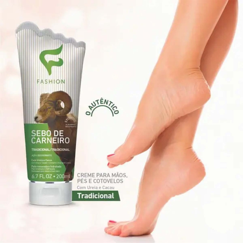 Creme Sebo De Carneiro Tradicional Para Mãos E Pés 200ml Ação desodorante. Com ureia e cacau. Pele renovada e hidratada. Para hidratação profunda da pele. Enriquecido cm alta concentração de agentes hidratantes como ureia e cacau, evita o ressecamento e deixa a pele macia e sedosa por muito mais tempo. Modo de usar: Aplique sobre a pele, massageando suavemente.
