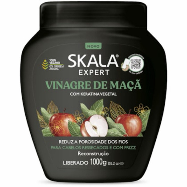 A linha Skala Vinagre de Maçã veio para acabar com os fios ressecados e com frizz. Essa linha reduz a porosidade, proporciona brilho extremo e fios saudáveis. Enriquecida com Vinagre de Maçã associado à vitamina E, D’Panthenol e Keratina Vegetal, proporciona uma reconstrução perfeita, selando as cutículas, restaurando e devolvendo maciez e beleza aos fios. Brilho espelhado garantido! Recomendamos que use e abuse dessa linha! Etapa do Cronograma Capilar: RECONSTRUÇÃO