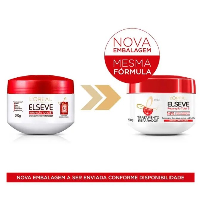 Detalhes do produto Esqueça tudo que você já viu sobre reparação! A Linha Elseve Reparação Total 5 de L’Oréal Paris, enriquecida com Cicatri Ceramida, identifica e repara os 5 principais danos causados aos fios no dia a dia: quebra, rigidez, opacidade, ressecamento e pontas duplas. O Creme de Tratamento Reparação Total 5+ age combatendo os danos externos ao cabelo desde os primeiros sinais. Possui tripla ação: repõe dia após dia os nutrientes perdidos pela fibra, repara a estrutura da fibra deixando os fios uniformes, selados e protegidos cicatrizando a fibra capilar. Tecnologia: Após 10 anos de pesquisa foi criada uma nova geração de Ceramida: a Cicatri Ceramida. Em fórmulas enriquecidas com recarga ômega, a Cicatri Ceramida age combatendo os danos desde os primeiros sinais. Resultados: - Desde a 1ª aplicação transforma a fibra: os cabelos são reconstituídos, ficam macios e brilhantes. - Progressivamente: combate os 5 sinais de danos para um efeito de Plástica Capilar: quebra, rigidez, opacidade, ressecamento e pontas duplas Benefícios: - Reduz a quebra - Dá brilho - Dá flexibilidade - Hidrata - Nutre - Remove as pontas duplas - Recupera o cabelo O que é o Creme de Tratamento Elseve Reparação Total 5+ ? A máscara de tratamento Elseve Reparação Total 5+ é um creme turbinado capaz de remover as pontas duplas e recuperar a estrutura da fibra do fio, deixando-os uniformes, selados e protegidos como se fosse uma cicatrização da fibra capilar. Além disso, ele ajuda a reduzir fios quebradiços, trazendo mais brilho e flexibilidade. Sua fórmula com a exclusiva Cicatri-Ceramida, age combatendo os danos externos ao cabelo desde os primeiros sinais, da raiz até as pontas. Seu resultado é um cabelo reconstruído, transformado, reparado, macio e brilhante. 5 principais danos que a Cicatri-ceramida trata: Quebra. Rigidez. Opacidade. Ressecamento. Ponta dupla. Como usar o Creme de Tratamento Elseve Reparação Total 5+? Aplique sobre os cabelos lavados e úmidos, deixe agir por 5 minutos. Enxaguar bem. A lista de ingredientes usados na composição é atualizada regularmente. Leia sempre a lista de ingredientes na embalagem para garantir que os ingredientes são adequados para seu uso pessoal. Advertências Uso externo. Não ingerir. Caso haja contato com os olhos, lave-os abundantemente. Se houver irritação, suspenda o uso imediatamente e procure orientação médica. Mantenha fora do alcance das crianças e animais domésticos. Conservar em local seco e arejado, protegido da luz e da umidade.