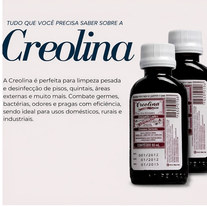 Creolina Pearson de 1 Litro e 500ml - Anti-séptico, Desinfetante Germicida Bicheiras A creolina Pearson possui em sua fórmula uma mistura de Cresóis e Fenóis associados a hidrocarbonetos aromáticos na forma miscível, produzindo um tipo de emulsão essencialmente fina em diluição na água. Assegura comprovada ação bactericida sobre os microorganismos: Salmonella typhimurium, Pseudomonas aeruginosa, Staphylococcus aureus, Listeria monocytogenes e Escherichia coli. Indicações: Como desinfetante de instalações pecuárias, tais como: pocilgas, galpões e estábulos. No preparo do campo operatório em pequenas e grandes intervenções cirúrgicas. No tratamento de miíases (bicheiras).