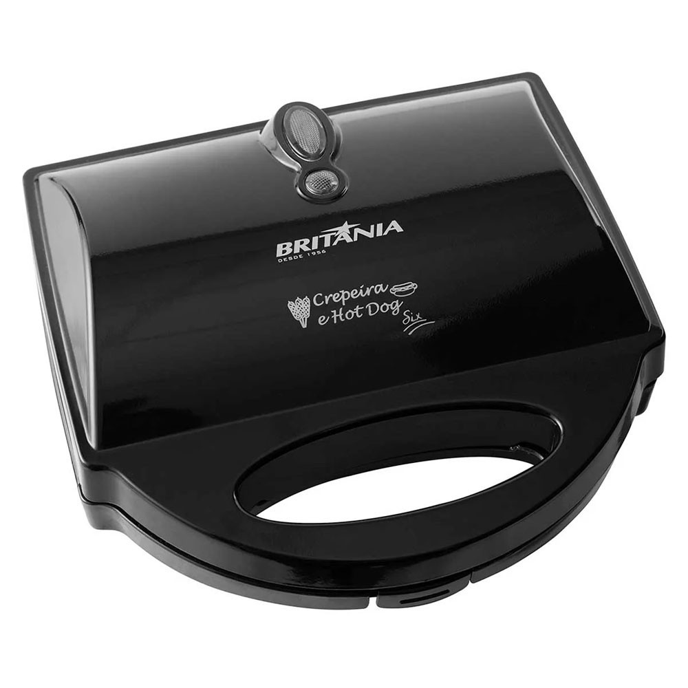 Crepeira e Hot Dog SIX Antiaderentes Britânia Marca: Britânia Modelo: SIX Composição: Metal e Baquelite. Quantidade de Crepes de uma vez: 6 unidades Rebaixo para apoio de palitos: Sim Luzes indicadoras de funcionamento e aquecimento: Sim Chapas com revestimento antiaderente : Sim Fácil de limpar: Sim Prepara crepes doces e salgados: Sim Aquecimento rápido: Sim Pés anti-deslizantes: Sim Pode ser armazenado na posição vertical: Sim Trava a tampa: Sim Com receitas no manual: Sim Conteúdo da Embalagem: 01 Crepeira e Hot Dog Britânia SIX 01 Manual do usuário Garantia do Fornecedor: 12 Meses ( Contra defeito de fabricação a partir da emissão da nota fiscal).