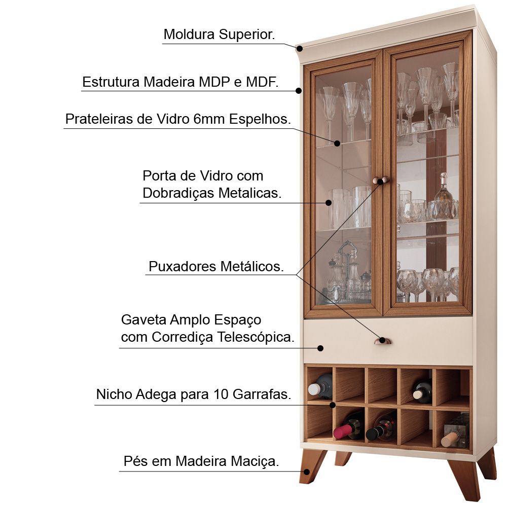 Cristaleira Bar e Adega Andorra Decorativa Sala de Estar OffWhite/Nature G26 - Gran Belo