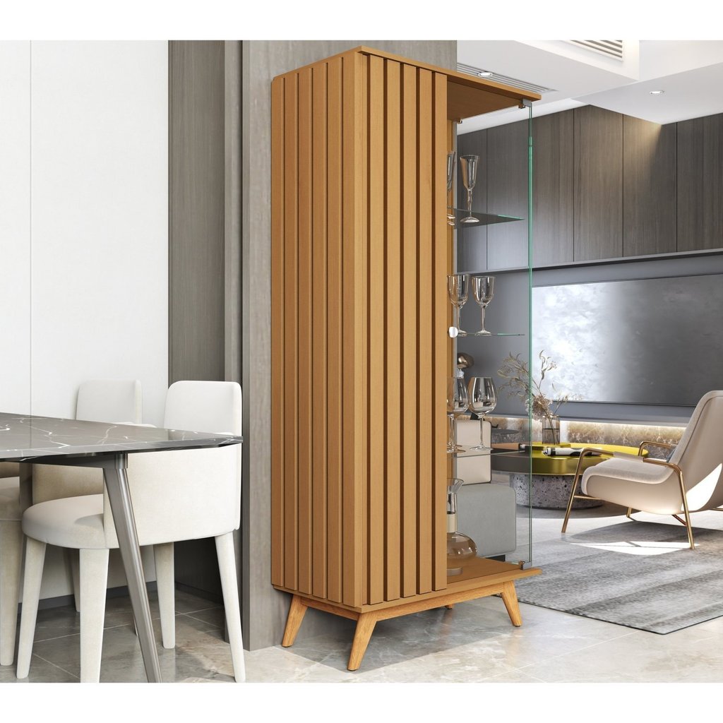 Cristaleira com Lateral e Porta Ripada Jb Açaí Vidro Temp 4mm e Pés e Travessas em Madeira Maciça Nature