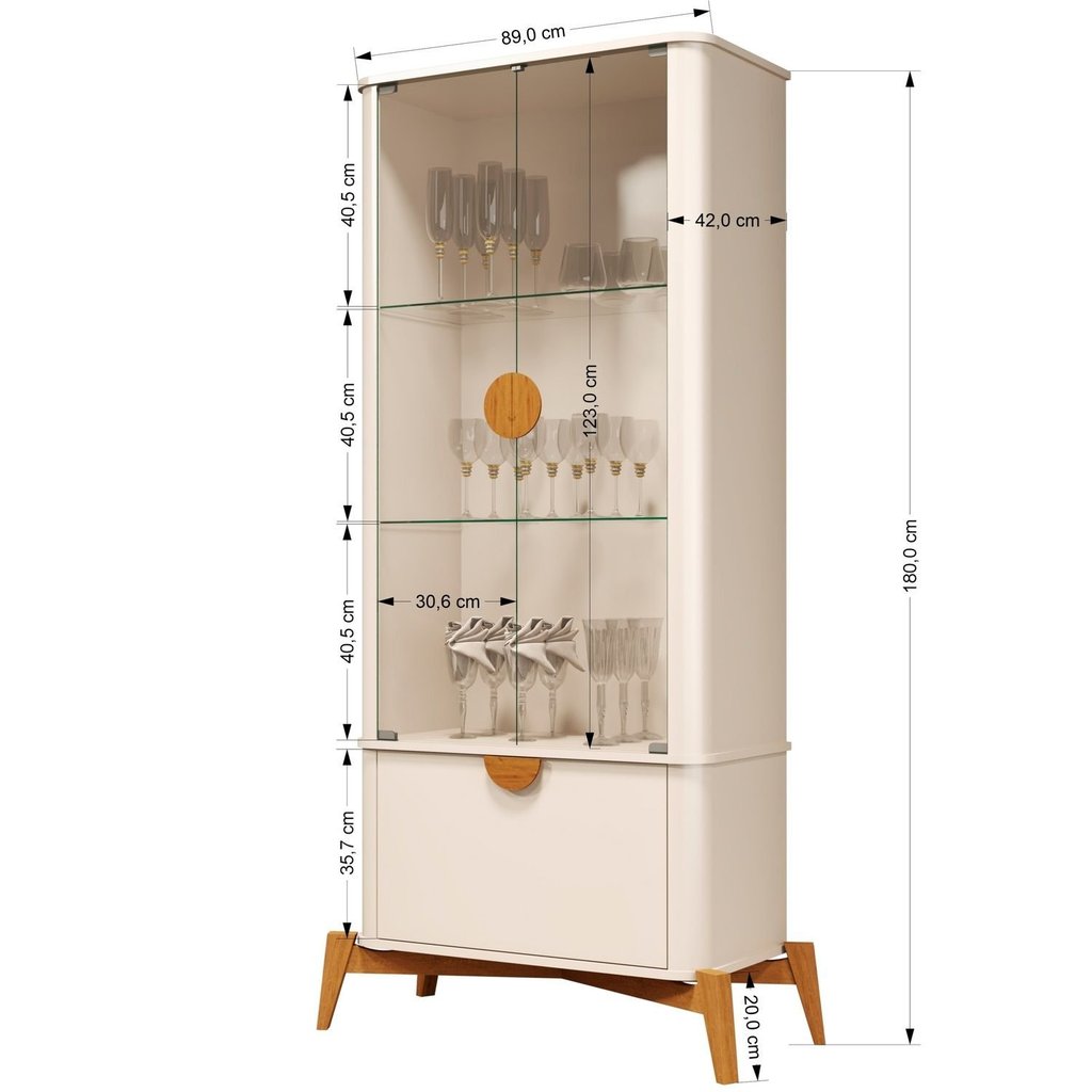 Cristaleira Moderna com Estrutura Lateral Curva. Portas e prateleiras de vidro temperado 4cm. Pés e travessas em madeira maciça. Produto entregue desmontado, montagem de responsabilidade do cliente. Acompanha uma cristaleira, kit ferragens e um manual de montagem. Estilo: Moderno Peso (kg): 44.3 Garantia: 06 Meses Altura (cm): 180 Acabamento: Pintura UV Largura (cm): 89 Possui Pés: Sim Porta Taças: Não Cor da Porta: Transparente Possui Adega: Não Possui Nichos: 3 Possui Portas: Sim Tipo de Porta: Basculante Altura dos Pés: 15 Possui Gavetas: Não Suporta Até (kg): 5 Possui Espelhos: Não Profundidade (cm): 42 Escala de Brilho: Semi-Brilho Material da Porta: MDF Origem do Produto: Nacional Possui Iluminação: Não Acabamento dos Pés: Pintura Ambiente Principal: Sala de Jantar Material Principal: MDF Possui Prateleiras: Sim Acabamento da Porta: Pintura UV Sapatas Niveladoras: Não Material da Prateleira: Vidro Acabamento da Prateleira: Vidro Tipo de Puxador da Porta: Externo Escala de Brilho da Porta: Semi-Brilho Peso Máximo por Prateleira: 2 Tipo de Dobradiça/Corrediça da Porta: Metálica Marca: JB Bechara Cor: Off White/Nature Cor do Produto: Off White/Nature Itens Inclusos: 1 Cristaleira, Kit Ferragens e Manual de Montagem. Cor Predominante: Bege Linha ou Coleção: Linha Quantidade de Prateleiras: 02 Prateleiras