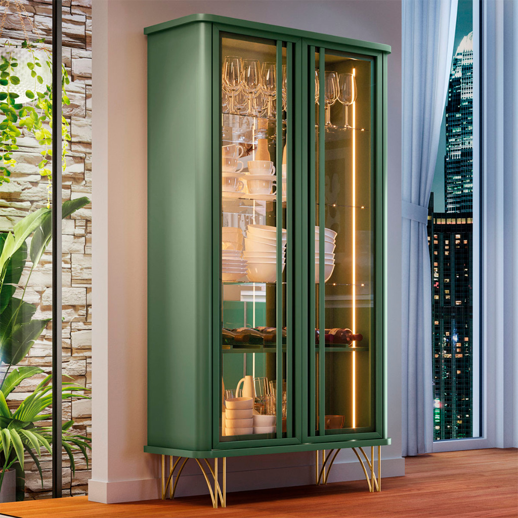 Esta elegante cristaleira é perfeita para exibir sua coleção ou objetos de decoração favoritos. Esta cristaleira oferece amplo espaço de armazenamento e permite que você mostre seus itens de forma elegante e sofisticada. Seu design alto é ideal para economizar espaço, tornando-o uma adição prática e elegante para qualquer sala de estar, sala de jantar ou cozinha. Modelo: Cristaleira Evora; Material da estrutura: MDF de 25 mm e 15 mm, espelho de 3 mm, vidro de 6 mm e pés em aço; Iluminação: Sim, em Led nas laterais internas; Altura: 180 cm; Largura: 90 cm; Profundidade: 41,5 cm; Quantidade de portas: 02 em vidro de 6 mm com moldura e fechamento click; Material de dobradiças: metálicas; Quantidade de gavetas: não se aplica; Com adega: sim, na prateleira de MDF para 06 garrafas; Com puxador: sim, plástico; Quantidade prateleiras: 04, sendo 3 de vidro 6 mm; Peso suportado: até 20 kg distribuídos; Tonalidade das Cores: Cinamomo: Fosco; Off White: Brilho; Verde Pistache: Fosco; Dourado: Brilho. Requer montagem: Sim (kit montagem incluso); Embalagem do envio: Papelão e plástico. Informações adicionais: - Os objetos que ambientam as fotos não acompanham o produto; - É de inteira responsabilidade do cliente a montagem do produto e/ou instalação, assim como possíveis irregularidades provenientes de manuseio inadequado; - Embora o produto acompanhe o manual de montagem, verifique a complexidade antes de decidir montá-lo sozinho, recomendamos que contrate um profissional de sua confiança; - Fique atento, nossas cores podem sofrer alterações dependendo do seu monitor; - ANTES DE MONTAR O SEU PRODUTO, verifique se há alguma peça danificada, caso esteja, prestaremos a devida assistência dentro do prazo da garantia.