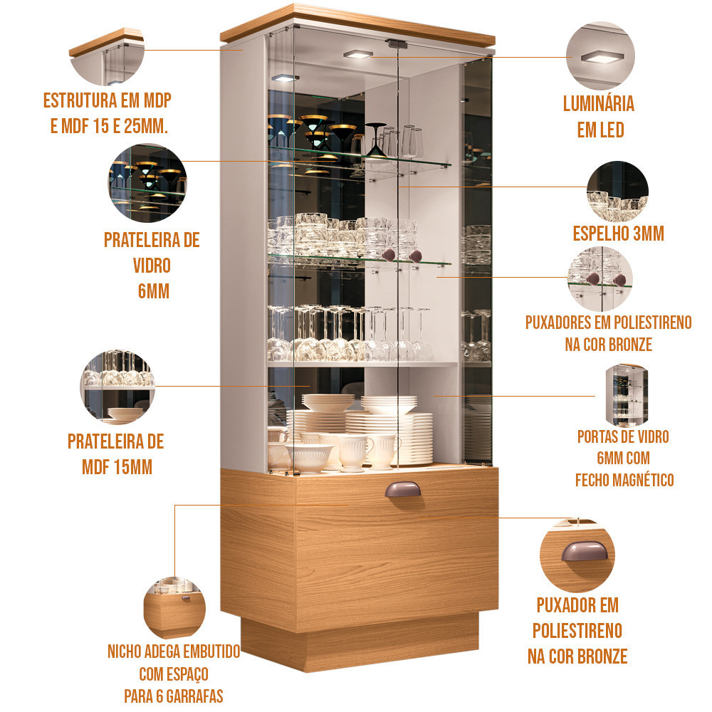 Super contemporânea, a Cristaleira Nicho Adega com Led Portas de Vidro Dominic B01 Cinamomo Off White - Lyam Decor transborda jovialidade, realça o ambiente e agrega muito valor à sua decoração! Com acabamentos impecáveis torna o espaço mais elegante e garante grande destaque para a composição dos móveis na ambientação. Expressa sofisticação e modernidade, possui sistema de fecho magnético nas portas, proporcionando segurança e facilidade, espelho ao fundo e luminária, que expõe com ainda mais graciosidade as louças, cristais, taças e decorações em geral. Conta também com um nicho adega embutido com espaço para 6 garrafas. Pode ser disposta em sala de estar ou jantar, entre ambientes integrados, hall de entrada, dentre outras maneiras de sua preferência. Uma aposta perfeita para quem deseja inovar sem erro! Dimensões da Cristaleira (L x A x P): 70 x 182 x 43,5 cm Medidas Internas: Altura da prateleira: 30 cm Largura da prateleira: 67 cm Profundidade das prateleiras superiores: 23 cm Profundidade da prateleira: 41,5 cm Altura da frente da gaveta: 42 cm Altura da base: 12 cm Características: Estrutura em MDP e MDF de 25mm e 15mm. Peças Cinamomo com acabamento em impressão UV Texturizada, peças na cor Off White em Impressão UV Alto Brilho. 02 Portas de Vidro 6mm com sistema de fecho magnético e dobradiças metálicas. 1 Gavetão com corrediças telescópicas e nicho adega embutido que comporta até 6 garrafas. Puxadores em poliestireno com acabamento metálico fosco. 02 Prateleiras de Vidro 6mm e 01 em MDF 15mm. Espelhos 3mm. Suporta até 5kg por prateleira e até 5kg na gaveta. Luminária de LED. Produto entregue desmontado, acompanha manual de montagem. Sistema de montagem: Girofix, cavilhas, parafusos e pregos. Sua limpeza deve ser feita com pano levemente umedecido em água limpa, não utilizar produtos abrasivos, desengordurantes, álcool ou solvente. Observações importantes: - Produto para uso residencial em ambiente interno, não devendo ficar exposto diretamente ao sol, calor e umidade excessivos. - Pode haver alguma diferença de tonalidade entre a imagem e o produto real, por conta do tratamento de imagens e a calibração de cores do seu monitor. - As imagens são meramente ilustrativas, não acompanham objetos de decoração e eletrônicos. - Ao receber a mercadoria, o cliente deve verificar as condições da embalagem, caso haja alguma avaria não assine o comprovante de recebimento. - Montagem, desmontagem e outras instalações serão de responsabilidade do cliente. Não nos responsabilizamos, no ato da entrega, por subir escadas/elevadores ou pelo transporte por guincho em apartamentos. Eventuais despesas são de responsabilidade do comprador. - Confira as dimensões do produto e certifique-se de que passará normalmente por supostos elevadores, portas, escadas e/ou corredores de sua residência.