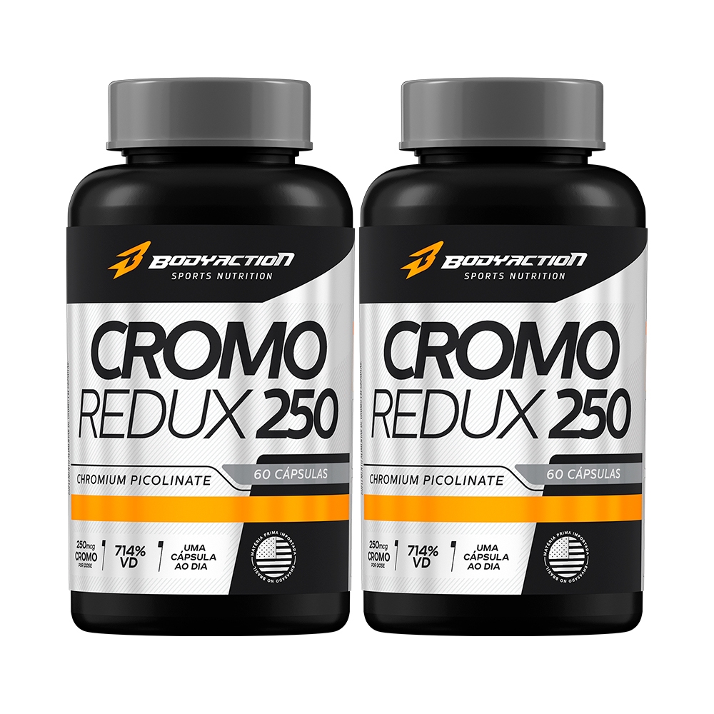 COMPOSIÇÃO DO ANÚNCIO: 01 Cromo Redux 250 - 60cps - Bodyaction O cromo redux 250 é um suplemento alimentar que apresenta em uma única porção 250mcg de picolinato de cromo, tendo como função principal auxiliar no metabolismo de proteínas, carboidratos e gorduras. INGREDIENTES: Picolinato de Cromo e Excipiente Talco. Ingredientes da cápsula: gelatina e água potável filtrada. NÃO CONTÉM GLÚTEN. SUGESTÃO DE USO: Sugere-se a ingestão de 1 (uma) cápsula 1 (uma) vez ao dia, ou conforme recomendação de um nutricionista ou médico. Produto indicado para maiores de 19 anos. ADVERTÊNCIAS: “ESTE PRODUTO NÃO É UM MEDICAMENTO.” “NÃO EXCEDER A RECOMENDAÇÃO DIÁRIA DE CONSUMO INDICADA NA EMBALAGEM.” “MANTENHA FORA DO ALCANCE DE CRIANÇAS.” CONSERVAÇÃO: Manter em lugar fresco, não úmido e ao abrigo da luz. Não consumir o produto se o lacre de proteção estiver violado. Após aberto consumir preferencialmente em 30 dias. IMAGEM MERAMENTE ILUSTRATIVA