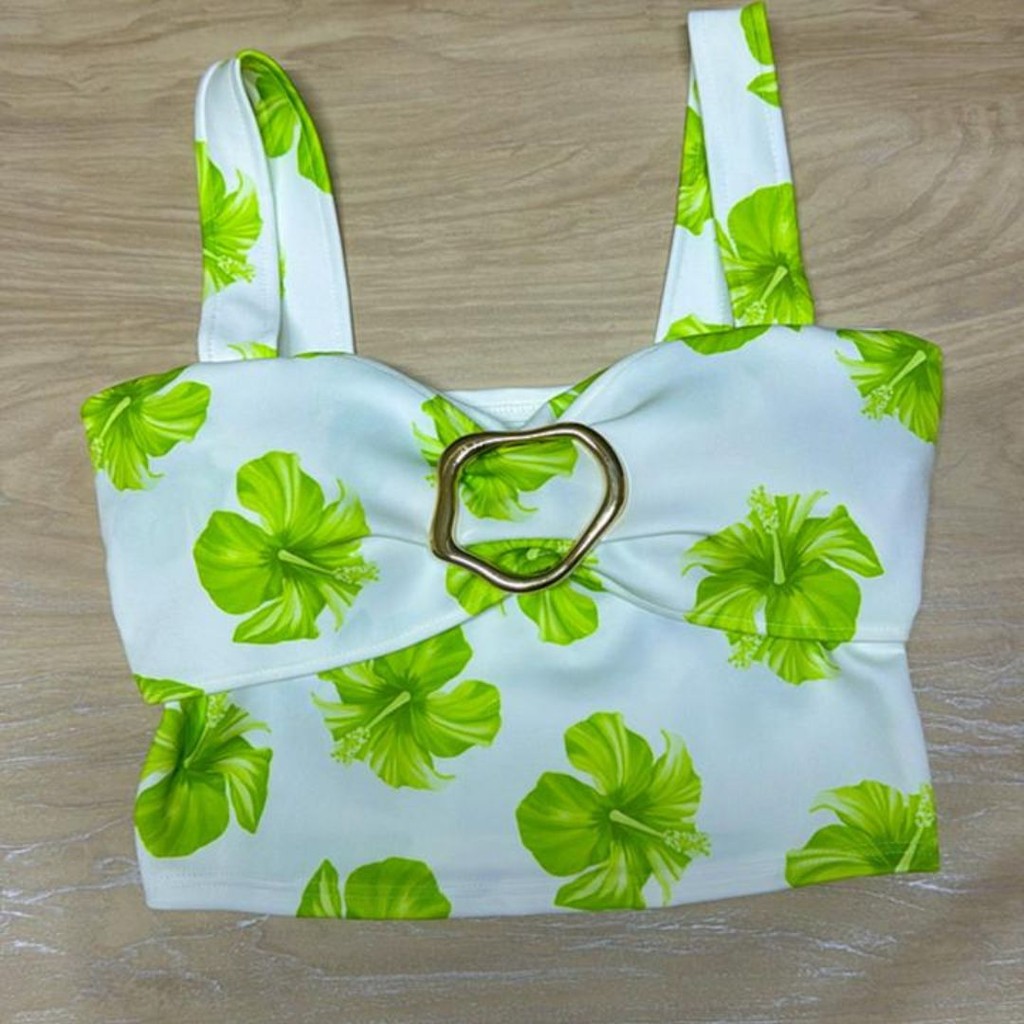CROPPED floral hiviscos trazendo um toque tropical e vibrante. possui uma fivela que adiciona charme, proporcionam maior sustentaçao e conforto, peca ideal para diversas ocaciones,podem ser combinados com saias,short ,ou calças. ✅Diferenciais do nosso Cropped: Fácil de lavar Tecido respirável Ótima elasticidade Possui bojo Composição 95% poliester 5% elastano ✅Tamanho: Único: M -G (veste 38-42). ✅Medidas: Busto: 90-96 Para duvidas estamos a disposição no chat.
