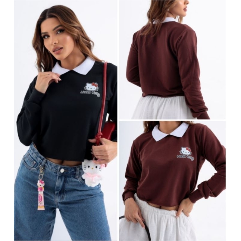 Cropped Blusa Moletom Femenino Com Gola Polo Branca Outono Inverno