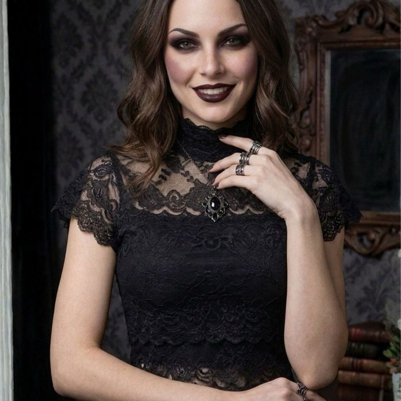 | Cropped Blusa Renda Gola Alta Gotica Preto Dark Feminina Curta este produto | R$ 39,95 | 33% | 4.7/5 | 6 |