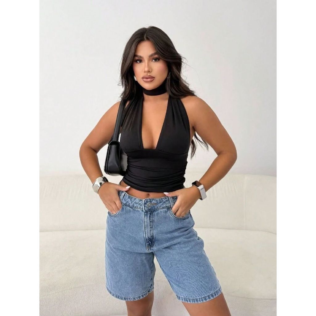 Cropped Com Amarraçao Multiformas Decote Forado Festa Moda Gringa Decotado Suplex Sexy Sustentaçao
