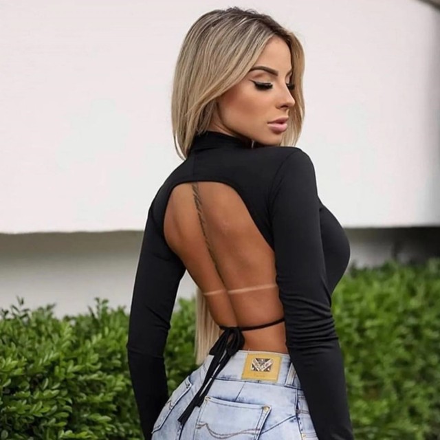 Cropped Costa Nua Manga Feminino com Gola Alta Manga Longa Top Com Manga