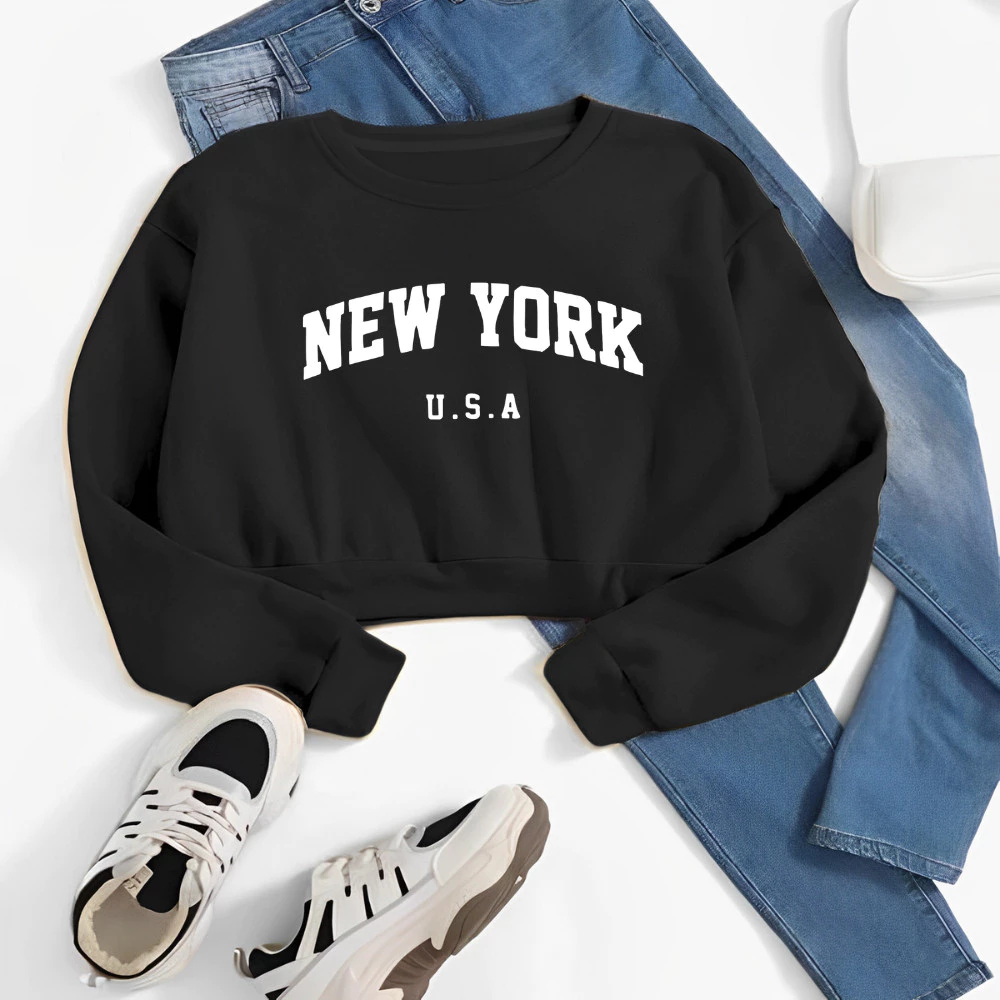 Cropped de Moletom Street Wear Estampado New York Usa Blusa De Frio Curta Com Manga Longa Quentinho