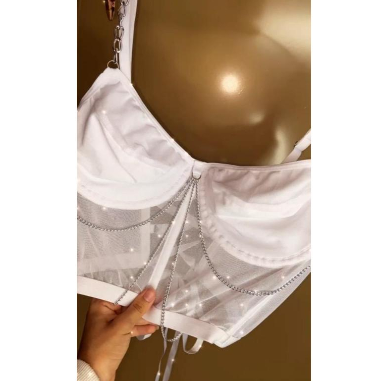 Cropped Delírio com Correntes Alça de Corrente Transparente Forro no Busto Costas de Fita Top Feminino
