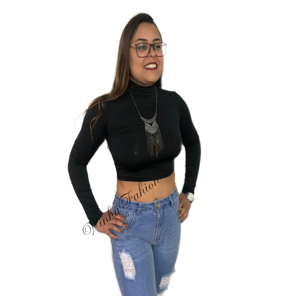Cropped Feminino Gola Alta Manga Longa Em Suplex