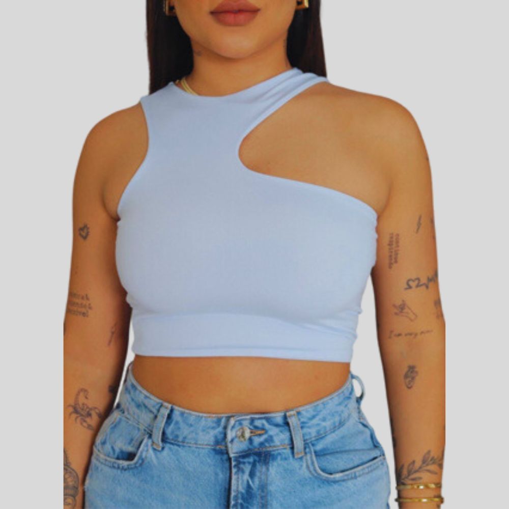 Cropped Feminino Regata Assimétrico Ombro Vazado Moda Top Tecido Duplo Premium Envio Imediato