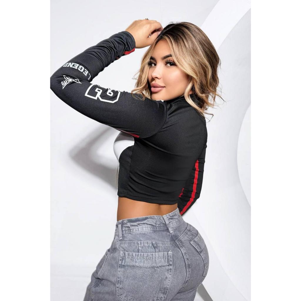 Cropped Feminino Tecido Suplex Moda Racing Manga Longa e Zíper Frontal