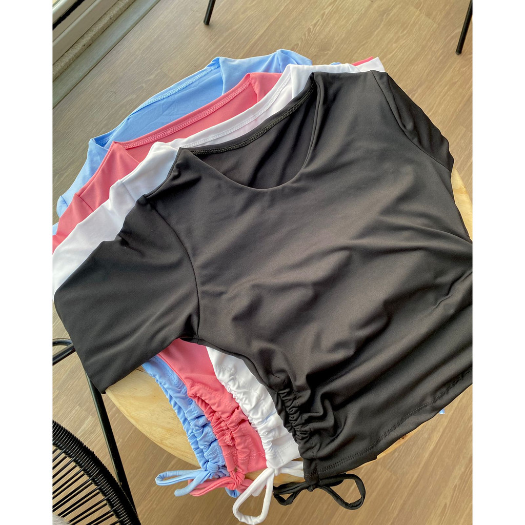 Cropped gola redonda manga longa com detalhe franzido lacinho na lateral blusa curta feminina