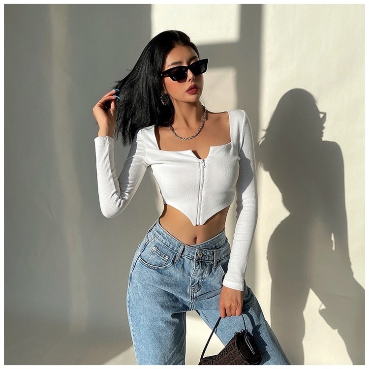 Cropped Manga Comprida Decote Quadrado e Zíper 7062
