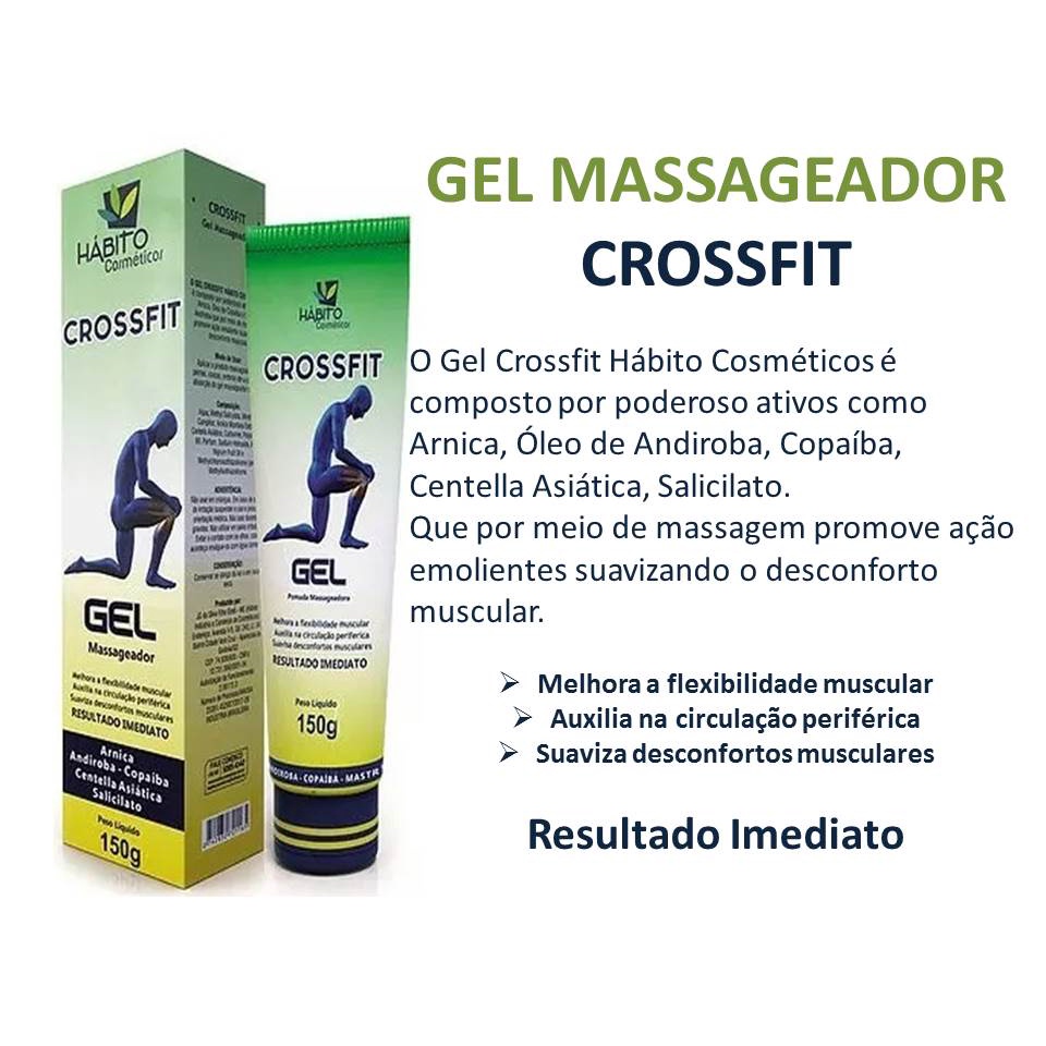 Kit com 3 CROSSFIT Gel Massageador 150g - Hábito Cosméticos - Produto com lacre direto da fábrica. O Gel Massageador Crossfit Hábito Cosméticos é composto por poderoso ativos como Arnica, Óleo de Andiroba, Copaíba, Centella asiática, Salicilato. Que por meio de massagem promove ação emolientes suavizando o desconforto muscular - Melhora a flexibilidade muscular - Auxilia na circulação periférica - Suaviza desconfortos musculares Resultado Imediato Utilize o campo de perguntas para tirar suas dúvidas.