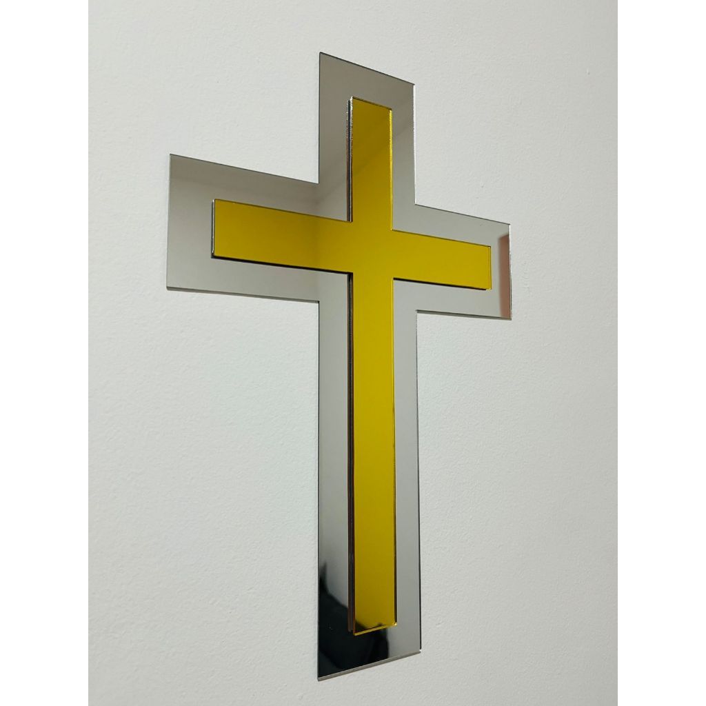 Cruz Religiosa Decorativa em Acrílico Espelhado Dourado com Crucifixo Prata Decoração Jesus 31x22