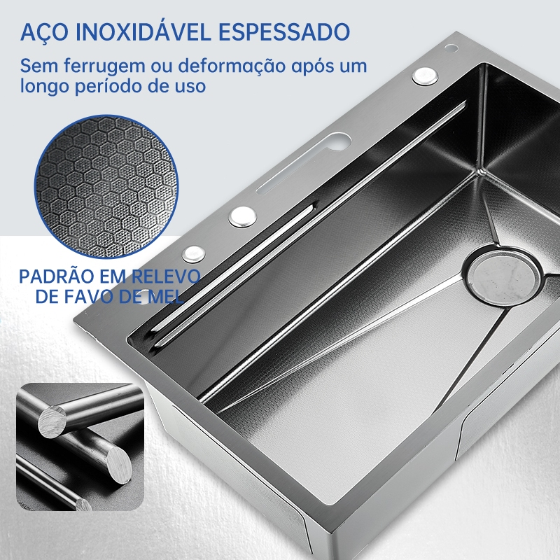 Cuba Gourmet Pia Cozinha Cascata Smart Multifuncional Pia Inteligente Premium Completa Moderna 💛Nossos produtos são todos feitos de aço inoxidável 304, a qualidade pode ser totalmente garantida, com suporte pós-venda de 3 anos! Nós fornecemos vídeos de instalação e uma garantia de cinco anos. se quaisquer problemas de qualidade surgir dentro do período de cinco anos, nós forneceremos a substituição gratuita. Por favor, sinta-se livre para comprar Tamanho da nossa pia de cozinha é 75X46cm. O tamanho do furo necessário deve ser 72X43cm. Torneira Multifuncional com Display Digital Inteligente A torneira multifuncional integra várias configurações avançadas, solucionando de maneira completa os problemas de limpeza e uso na cozinha. Interruptor com Tecla de Piano Inspirado nas teclas de piano, um toque adiciona água; a operação é simples e fácil de alternar entre os modos de água. Exibição em Tempo Real da Temperatura da Água O display LCD usa geração de energia hidrelétrica, portanto, não é necessário conectar à energia elétrica ou usar baterias, podendo ser utilizado a qualquer momento sem a necessidade de testar manualmente a temperatura da água. Interruptor de Temperatura da Água com Botão de Rotação Ao girar o botão, é possível controlar a temperatura da saída de água, permitindo ajustar a temperatura conforme desejado. Decoração com Iluminação Ambiente Decoração inovadora para a cozinha, com iluminação ambiente adicionada ao corpo da pia, tornando sua cozinha mais tecnológica. Torneira de Cozinha Retrátil de 60 cm A torneira de cozinha pode girar 360 graus e se estender até 60 cm, equipada com 3 modos de fluxo de água para atender a diversas necessidades de limpeza na cozinha. Lavador de Copos de Alta Pressão Controle a saída de água com um botão, sem necessidade de pressão manual; garante uma lavagem completa e eficiente dos copos, economizando tempo. Aço Inoxidável 304 com 3mm de Espessura Espessura real do painel de 3 mm, proporcionando alta resistência e suporte para acomodar mais utensílios de cozinha. Água em Forma de Cascata A água é suave e delicada, simulando o fluxo natural da água para transformar a limpeza em uma experiência agradável. Projetado para Alta Capacidade A pia possui uma configuração ampliada e aprofundada para maior capacidade, com design integrado que permite limpeza sem restrições e liberdade total. Proteção com Textura de Colmeia O padrão de colmeia levemente elevado protege a superfície da pia contra arranhões, mantendo-a esteticamente agradável e como nova por mais tempo. Camada Anti-condensação Reforçada Camada resistente à umidade e ao ruído, com isolamento em EVA para reduzir o som e prevenir a umidade ao redor, aumentando a durabilidade da pia Design de Espaço para Drenagem em Ângulo Tubo PE reforçado, com proteção contra insetos, odores, obstruções e vazamentos. O design de drenagem à direita libera espaço para os utensílios de cozinha, aumentando significativamente a eficiência do espaço. Importante: Cuba aceita triturador Filtro de água não incluso Material da torneira: Aço Inox Cuba não é elétrica (não é ligada na energia) Torneira mono-comando (aceita água quente e fria) A água quente é proveniente do sistema de aquecimento da residência, seja elétrico, gás, solar. A torneira não é elétrica Garantia 12 meses. Temos peças de reposição Filtro de carvão ativado para a segunda torneira deve ser comprado separadamente (não incluso) Especificações: O tamanho da nossa pia de cozinha é 75X46cm. O tamanho do furo necessário deve ser 72X43cm. Medidas externas: 75 X 46 X 22 cm (CxLxP) Medidas internas: 70 X 36 X 20 cm (CxLxP) Material: Aço inoxidável 304 Espessura externa: 3 mm Furação da Torneira: Integrada Furação da Válvula: 4.1/2" Válvula Escape/Ladrão: Inclusa Indicação: Cozinha, Churrasqueira Compatível com Triturador de Resíduos Sistema Anti-Ruído Acessórios Inclusos Itens inclusos: - 1 Cuba Gourmet Quadrada Aço Inox 304 75x46cm - 1 Torneira Monocomando com Cascata Spray - 1 Lavador de Copos - 1 Válvula de escoamento - 1 Válvula e tubulação do ladrão - 1 Dosador de detergente 300ml. - 1 Cesto Escorredor Aço Inox 304 - 1 Cesto para lavagem de alimentos - 1 Tábua de Corte Garantia do vendedor: 60 meses