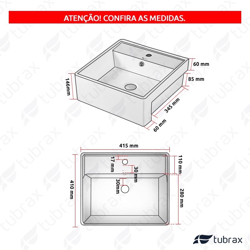 Cuba de porcelana - BAB0006 Produto produzido em porcelana cerâmica de alta qualidade. Não perde o brilho e não sofre amarelamento com o tempo. Acabamento perfeito Além do design perfeito, a cuba Tubrax possui um acabamento perfeito. Obs: Leves alterações na coloração e acabamento podem acontecer entre diferentes lotes do produto. ESPECIFICAÇÕES TÉCNICAS - Marca: Tubrax - Referência do Modelo: BAB0006 - Utilização: Semi-encaixe - Possui furo para torneira: SIM (35 mm de diâmetro) - Material: Porcelana Cerâmica - Acabamento: Esmalte branco brilhante - Itens Inclusos: 1 Cuba de porcelana - Válvula compatível: 1 1/4 polegadas (não inclusa) - Dimensão (C x L x A): 41 cm x 41,5 cm x 14,6 (dimensões externas) - Garantia: 12 meses contra qualquer defeito de fabricação. - Distribuição: TBX Indústria, Importação e Comércio Ltda