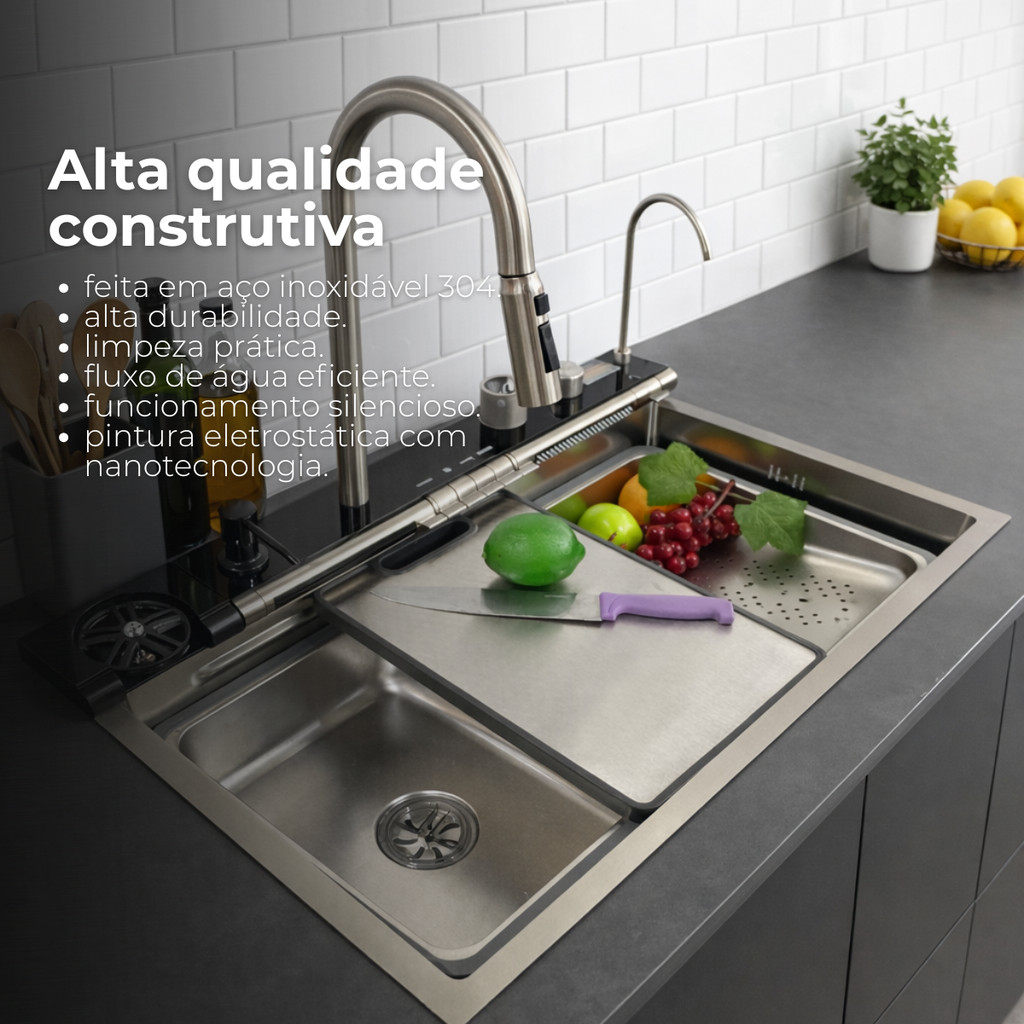 CUBA DE COZINHA GOURMET CASCATA FLEXÍVEL INTELIGENTE PREMIUM!!! A Cuba Gourmet de Cozinha em Aço Inox 304 é o ápice da modernidade e funcionalidade, projetada para quem valoriza praticidade e sofisticação. Com sistema automatizado e comandos por botões, ela conta com dois jatos de água em cascata para a lavagem de louças e alimentos, agregando um toque elegante ao design. Inclui também um lavador de copos integrado, facilitando a limpeza de utensílios delicados, e uma torneira com três tipos de jato, adaptando-se às diferentes necessidades de uso. Possui um display em LED que informa a temperatura da água, conferindo à cuba um incrível visual moderno. Para tornar a rotina ainda mais prática, a cuba vem com dois cestos removíveis, ideais para organizar e lavar louças com eficiência. Além disso, acompanha uma tábua de corte que se encaixa perfeitamente, transformando a cuba em uma área de trabalho multifuncional. Destaques: A cuba é produzida em aço inoxidável 304 de alta qualidade, com acabamento em pintura eletrostática e nanotecnologia, resultando em um produto resistente à ferrugem, riscos e desgaste. O inovador sistema de cascata da pia é um verdadeiro divisor de águas! Ele não só proporciona à sua cozinha uma aparência moderna e inovadora, mas também facilita a limpeza de legumes, saladas e frutas. Este modelo conta com ajuste de posição da cascata, permitindo direcionar o fluxo de água conforme desejado, o que aumenta o conforto e a praticidade. A elegante torneira gourmet extensível em aço inox 304 é retrátil e possui 3 modos de pulverização. Proporciona mais facilidade na limpeza, na higienização de alimentos e na organização da pia. O sistema de acionamento do ralo permite que você drene a água facilmente, ativando um botão, sem a necessidade de tocar na pia e mantendo as mãos secas. Acompanha uma segunda torneira para água filtrada. O filtro de carvão ativado pode ser instalado facilmente, mas deve ser comprado separadamente. Todas as funções da cuba podem ser controladas por meio de 5 teclas no painel: Torneira Principal, Cascata 1, Cascata 2, Lavador de Copos e Torneira de Água Filtrada. Equipado com um moderno painel em LED, que mostra a temperatura da água e o tempo de acionamento da torneira principal. A alimentação deste painel não requer energia elétrica, pois a própria passagem da água pelos capacitores gera a energia necessária para seu funcionamento, destacando a sustentabilidade do produto. Com acabamento moderno e inovador, a textura em colmeia no fundo e nas laterais da cuba oferece não apenas uma beleza incomparável, mas também facilita imensamente a higienização, já que os resíduos não grudam facilmente.Medidas externas: 75 x 46 x 23 cmMedidas internas: 70 x 36 x 31 cmMaterial: Aço inoxidável 304Acabamento: Pintura eletrostática prata com nanotecnologiaEspessura: 3 mmAplicação: Embutir ou sobreporFuração da torneira: EmbutidaFuração do dosador: 2,8 cmFuração do lavador de copos: 2,8 cmFuração da válvula: 4 1/2"Válvula escape/ladrão: SimCapacidade do dispenser de detergente: 500 mlIndicação: Cozinha, churrasqueiraCompatível com triturador: SimAntirruído: SimAcessórios inclusos: Sim Itens inclusos: 2 Cestos auxiliares aço inox1 Tábua de corte dupla face (inox e polietileno)1 Dispenser detergente 500ml1 Lavador de copos1 Ducha auxiliar1 Ducha cascata1 Torneira Extensível1 Saída para filtroFiltro de água não incluso.A cuba não é elétrica, ou seja, não é ligada à energia elétrica.Torneira monocomando para água quente e fria.A torneira não é elétrica; a água quente provém do sistema de aquecimento da residência (elétrico, gás ou solar).O filtro de carvão ativado para a torneira do filtro deve ser comprado separadamente (não incluso).12 meses contra defeitos de fabricação. Disponibilizamos todas as peças de reposição a pronta entrega.Agora o texto está mais claro, fluido e com uma formatação mais organizada! Se precisar de mais alguma coisa, estou à disposição.MATERIAL DE QUALIDADECASCATA DE PIASUPER TORNEIRAACIONAMENTO DO RALOTORNEIRA FILTRADAPAINEL COM 5 TECLASPAINEL COM DISPLAY EM LEDTEXTURA EM COLMEIAEspecificações:Importante:Garantia: