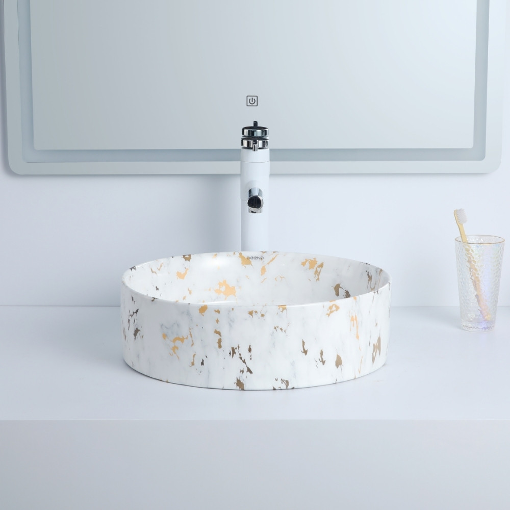 A Cuba Deend Terrazzo Dorato é uma peça sofisticada que une exclusividade e modernidade para transformar o banheiro em um ambiente elegante. Produzida em cerâmica de alta qualidade, apresenta acabamento brilhante que valoriza os efeitos marmorizados em tons dourados e acobreados sobre o fundo branco, trazendo personalidade única à decoração. Com design redondo e dimensões compactas, essa cuba é ideal para quem busca praticidade sem abrir mão da sofisticação. Seu estilo diferenciado harmoniza facilmente com diferentes tipos de torneiras e bancadas, oferecendo versatilidade e requinte ao ambiente. A cuba não acompanha válvula nem torneira. Imagens meramente ilustrativas. Características: Marca: Deend Modelo: D250492 Material: Cerâmica Cor: Branco com detalhes em dourado Acabamento: Brilhante Diferencial: Efeito marmorizado exclusivo Formato: Redondo Medidas: 39 x 39 x 12 cm (Comprimento x Largura x Altura) Instalação: De sobrepor Por se tratar de um processo de marmoreio aleatório, os desenhos da peça podem apresentar pequenas variações em relação às fotos, mantendo sempre o padrão estético e a qualidade do acabamento. Benefícios: Design redondo elegante e sofisticado Acabamento brilhante que realça os detalhes em dourado Cada peça possui desenho único, garantindo exclusividade Ideal para bancadas menores sem abrir mão do estilo Durabilidade e resistência garantidas pela cerâmica Conteúdo da embalagem: 1 Cuba de cerâmica Deend Terrazzo Dorato
