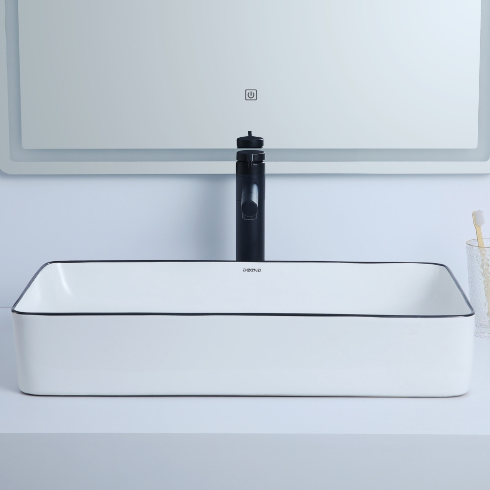 A Cuba Deend Rettangolo Squadro é ideal para quem busca modernidade e imponência no banheiro. Em tamanho ampliado, proporciona uma área de uso maior que o comum, unindo praticidade e sofisticação em uma peça de destaque. Produzida em cerâmica de alta qualidade, conta com acabamento brilhante que garante resistência, durabilidade e facilidade de limpeza. Com design retangular e borda preta decorativa, essa cuba de apoio traz um visual contemporâneo e marcante. Seu formato alongado se adapta perfeitamente a bancadas espaçosas, oferecendo versatilidade e elegância na composição do ambiente. A cuba não acompanha válvula nem torneira. Imagens meramente ilustrativas. Características: Marca: Deend Modelo: D250407 Material: Cerâmica Cor: Branco Acabamento: Brilhante Diferencial: Borda preta Formato: Retangular Medidas: 61 x 34 x 11 cm (Comprimento x Largura x Altura) Instalação: De sobrepor Benefícios: Design imponente que valoriza banheiros amplos Tamanho maior que oferece mais área de uso Acabamento brilhante com detalhe de borda preta Alta durabilidade e resistência da cerâmica Praticidade na limpeza e compatibilidade com diversas bancadas Conteúdo da embalagem: 1 Cuba de cerâmica Deend Rettangolo Squadro