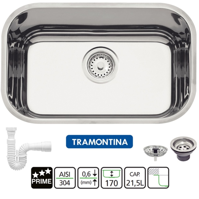 Este é o modelo Tramontina Cuba Lavínia 47 BL que é conhecida no mercado como Cuba Inox Nr. 1 da linha Prime. Possui as dimensões 47 x 30 x 17 cm (C x L x A) e sua instalação é de embutir. Fabricada em Aço Inox AISI 304, sua chapa possui espessura de 0,6 mm e seu é acabamento é alto brilho. Este modelo acompanha válvula de 3.1/2 e também sifão extensível plástico de 70cm.
