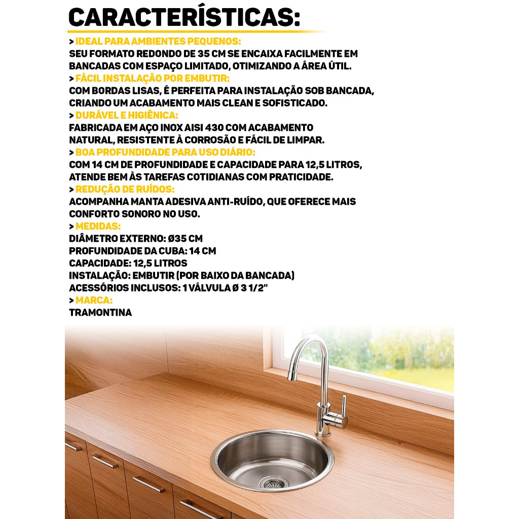 Cuba Inox Redonda 35x14 De Embutir Tramontina Compacto Para Cozinha Lavabo Aço Inox