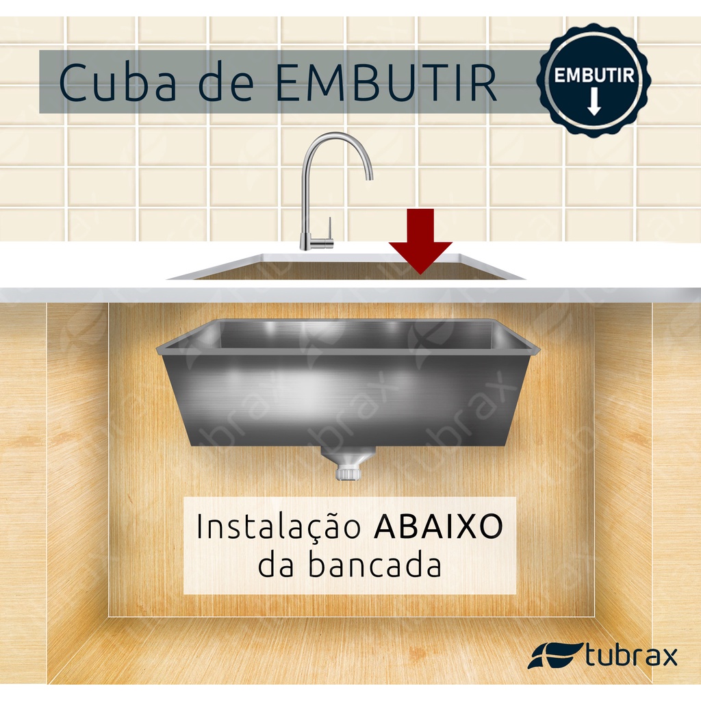 ATENÇÃO: Cuba projetada para aplicação SOMENTE EMBUTIDA. Cuba de cozinha de embutir Tubrax - modelo CAC0022-N A cuba de embutir Tubrax é ideal para quem procura soluções para cozinhas/área gourmet modernas com praticidade e estilo. Produzida em aço inox 304 de alta qualidade, com chapa de 0,8 milímetros de espessura e acabamento acetinado, este produto transmite elegância e luxo ao seu ambiente. Manta emborrachada contra ruídos é um diferencial das Cubas Tubrax. ATENÇÃO: Cuba projetada para aplicação SOMENTE EMBUTIDA. Obs: Leves alterações na coloração e acabamento podem acontecer entre diferentes lotes do produto. ESPECIFICAÇÕES TÉCNICAS: - Marca: Tubrax - Referência do Modelo: CAC0022-N - Acabamento: Acetinado escovado linear - Material: Aço Inoxidável 304 - Comprimento: 58 cm - Largura: 40 cm - Profundidade: 17 cm - Furo para válvula de 4½ " (Não incluso) - Peso bruto (com embalagem): 4,176 Kg - Garantia: 3 meses contra qualquer defeito de fabricação. ATENÇÃO: Cuba projetada para aplicação SOMENTE EMBUTIDA.
