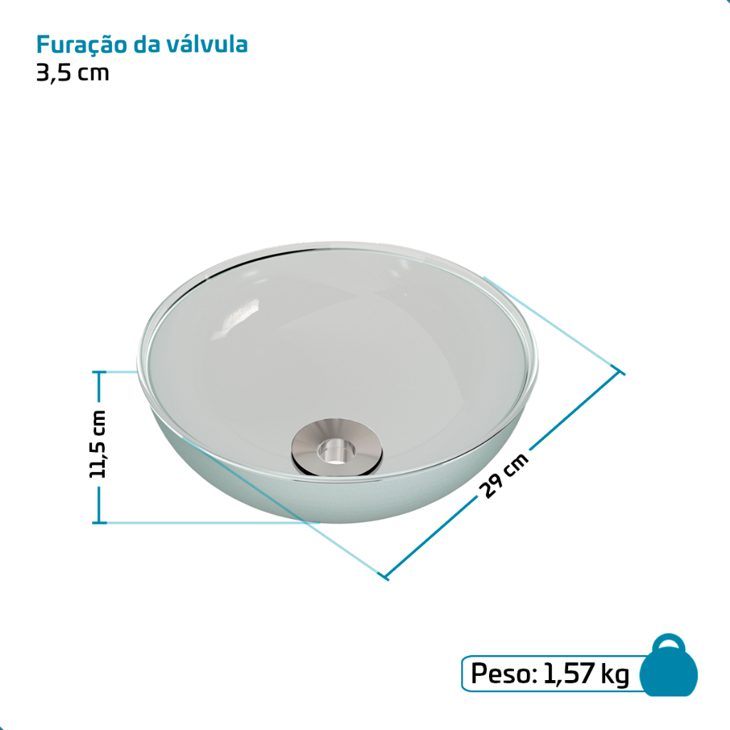 Cuba Pia de Apoio em Vidro Redonda 29cm para Banheiro + Válvula – BELTEMPO A cuba de alta qualidade possui 6 mm de espessura, e o vidro tratado mantém o brilho mesmo com o uso frequente. Seu acabamento cuidadoso garante bordas suaves e seguras. A instalação é realizada sobre o móvel (gabinete, armário ou bancada), mantendo toda a cuba aparente (cuba de apoio). Além de garantir excelente escoamento da água, seu formato facilita a limpeza. A válvula, essencial para a instalação, é produzida em metal, um material resistente e durável. DIFERENCIAIS - Cuba de apoio - Design de alto padrão - Feita em vidro - Produto de alta qualidade - Excelente acabamento - Fácil limpeza - Válvula produzida em metal - Embalagem com proteção extra para transporte INFORMAÇÕES TÉCNICAS DA CUBA - Modelo: Cristal - Formato: Redondo - Tipo de cuba: Apoio - Material: Vidro - Acabamento: Texturizado INFORMAÇÕES TÉCNICAS DA VÁLVULA - Tipo: Padrão - Material: Metal - Acabamento/cor: Cromado - Bitola da rosca de saída: 7/8’’ - Acompanha: Rosca de fixação, arruela, anel de vedação e tampa DIMENSÕES DA CUBA - Diâmetro: 29 cm - Altura: 11,5 cm - Profundidade: 10 cm - Espessura: 6 mm - Peso: 1,5 kg DIMENSÕES DA VÁLVULA - Diâmetro: 7/8” - Altura da rosca: 6,8 cm - Diâmetro superior (encaixe na pia): 5,7 cm - Diâmetro inferior (rosca de saída): 3,0 cm - Furo de instalação: 3,5 cm - Peso: 78 g ITENS INCLUSOS - 1 Cuba de Vidro - 1 Válvula GARANTIA DE 3 MESES