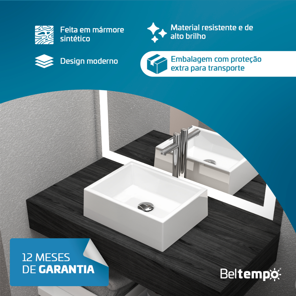Cuba Pia de Apoio Sobrepor Retangular 42x32 Branca Banheiro Lavabo Beltempo BT-3387 Apresentamos a Cuba BT-3387: Design Moderno e Durabilidade para o Seu Banheiro Descubra a Cuba BT-3387 da Beltempo, a escolha perfeita para quem busca transformar o banheiro com design moderno e um visual que valoriza o espaço. Fabricada em mármore sintético de alta durabilidade e com acabamento brilhante, esta cuba de apoio não só encanta pela beleza, mas também garante funcionalidade e facilidade no dia a dia. Com excelente escoamento de água, seu formato é ideal para uma limpeza prática e uma instalação sem complicações. Adquira um produto de excelência da Beltempo, uma marca com 30 anos de inovação, qualidade e confiança no mercado. DIFERENCIAIS - Feito em mármore sintético - Material resistente e de alto brilho - Design moderno - Embalagem com proteção extra para transporte - Fácil limpeza - Garantia de 12 meses INFORMAÇÕES TÉCNICAS - Modelo: Amazonita BT-3387 - Formato: Retangular - Tipo de cuba: Apoio - Material: Mármore sintético - Revestimento: Polido - Acabamento: Hard Lacca Pu - Acabamento brilhante: Gel Coat - Cor: Branca DIMENSÕES - Altura: 13,5 cm - Largura: 32,3 cm - Comprimento: 41,6 cm - Profundidade: 9 cm - Furação da válvula: 3,5 cm (Compatível com válvulas 7/8) - Peso: 5,35 kg Esse anúncio é somente da cuba de mármore sintético. NÃO acompanha torneira e válvula.