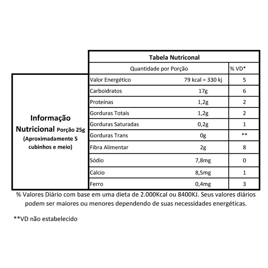 Conheça a Linha Cubinhos Fit! Cubinhos de frutas 100% naturais. Feitos com ingredientes deliciosos, saborosos e fresquinhos. Ideal para substituir aquela vontade de comer doces açucarados! É uma excelente opção para lanches rápidos, sobremesas, levar para o trabalho, academia entre outros Peso de cada pacote: Escolha entre 100g ou 250g Escolha entre os sabores: 1-Tâmara, Amêndoa e Laranja Ingredientes: Tâmara, Banana, Amêndoa, Quinoa farinha, Raspas de Laranja. NÃO CONTÉM GLÚTEN. Alérgicos: Contém: Amêndoa. Pode Conter: Amendoim, Soja, Nozes, Castanha de Pará e Castanha de Caju. 2-Tâmara, Amora e Cranberry Ingredientes: Tâmara, Banana, Castanha de Caju, Cranberry, Amora, Quinoa em farinha, Canela pura NÃO CONTÉM GLÚTEN. Alérgicos: Contém: Castanha de Caju. Pode Conter: Amendoim, Soja, Nozes, Amêndoa e Castanha de Pará. 3-Paçoca com Cacau Ingredientes: Tâmara, Banana passa, Amendoim, Uva passa, cacau. NÃO CONTÉM GLÚTEN. Alérgicos: Contém: Amendoim. Pode Conter: Soja, Nozes, Amêndoa, Castanha do Pará e Castanha de Caju. 4 - Coco, Castanha de Caju com Cacau Ingredientes: Tâmara, Banana passa, Coco, Uva passa, castanha de caju e cacau. NÃO CONTÉM GLÚTEN. Alérgicos: Contém: Castanha de caju. Pode Conter: Soja, Nozes, Amendoim, Castanha do Pará e Amêndoa. 5 - Tâmara, Amêndoa e Limão Ingredientes: Tâmara, Banana, Amêndoa, Quinoa farinha, Limão siciliano. NÃO CONTÉM GLÚTEN. Alérgicos: Contém: Amêndoa. Pode Conter: Amendoim, Soja, Nozes, Castanha de Pará e Castanha de Caju. 6- Bananinha Cremosa Ingredientes: Banana cremosa, Farinha de banana verde. NÃO CONTÉM GLÚTEN. Alérgicos: Pode Conter: Amendoim, Soja, Nozes, Amêndoa, Castanha do Pará e Castanha de Caju. 7- Brownie, Café e Gotas de Chocolate Vegano Ingredientes: Tâmara, pastas de cast. de caju, gotas de chocolate vegano, cacau em pó, massa de cacau, e café. NÃO CONTÉM GLÚTEN. Alérgicos: Contém: Castanha de caju. Pode Conter: Soja, Nozes, Amendoim, Castanha do Pará, Amêndoa, Macadâmia e Proteína da clara do ovo *Imagens Ilustrativas