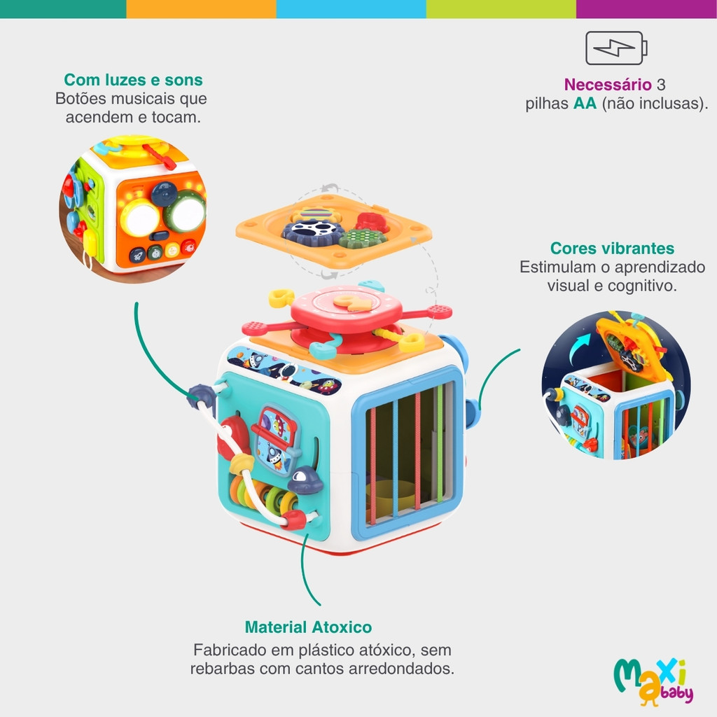 Cubo de Atividade Brinquedo Didático Educativo 7 formas de Uso com Som e Luzes Tiko Maxi Baby O Cubo de Atividades Sensorial Educativo Tiko Maxi Baby é o brinquedo ideal para transformar o aprendizado em pura diversão! Desenvolvido especialmente para estimular a curiosidade e o desenvolvimento das habilidades motoras e cognitivas dos pequenos, este cubo interativo 7 em 1 oferece uma experiência completa de descobertas, sons e cores que encantam e educam ao mesmo tempo. Com um design colorido, moderno e totalmente seguro, o Cubo de Atividades para Bebês traz diferentes lados com desafios lúdicos e educativos — incluindo labirinto de contas, relógio, engrenagens giratórias, blocos de encaixe, elásticos coloridos, tambor musical e centro de música com luzes e sons. Cada lado desperta a imaginação e ajuda a desenvolver a coordenação motora fina, o raciocínio lógico, a percepção tátil e visual, além de incentivar a exploração independente e o aprendizado através da brincadeira. Fabricado com plástico de alta qualidade, atóxico e sem rebarbas, o cubo possui cantos arredondados e textura suave, garantindo total segurança para o bebê. Seu tamanho é perfeito para as mãozinhas pequenas, facilitando o manuseio e tornando cada descoberta ainda mais divertida. As cores vibrantes e contrastantes foram cuidadosamente escolhidas para prender a atenção dos bebês e estimular a percepção das diferentes formas e movimentos. O Cubo Educativo Tiko Maxi Baby também conta com funções sonoras e luminosas (utiliza 3 pilhas AA, não inclusas) que tornam a brincadeira ainda mais envolvente. Os pequenos podem tocar o tambor interativo, acionar botões musicais e observar o cubo ganhar vida com luzes coloridas — uma maneira encantadora de estimular o ritmo, a coordenação e a concentração. Perfeito para bebês a partir de 18 meses, este brinquedo sensorial é um convite à descoberta e à imaginação. Seja para brincar sozinho ou em momentos de interação com os pais, o Cubo de Atividades Tiko Maxi Baby oferece um aprendizado divertido e cheio de possibilidades. Com ele, cada lado é uma nova aventura — um verdadeiro mundo de cores, sons e movimento, pensado para acompanhar o crescimento do bebê com alegria, segurança e estímulo. Um presente completo, educativo e irresistível para os pequenos exploradores que estão descobrindo o mundo! Principais Características: - Idade recomendada: A Partir de 18 meses. - Brinquedo 7 em 1: inclui labirinto de contas, relógio, engrenagens, blocos de encaixe, elásticos coloridos, tambor musical e centro de música com luzes e sons. - Altamente educativo: estimula a coordenação motora fina, percepção sensorial, raciocínio lógico e concentração. - Cores vivas e vibrantes: atraem a atenção e contribuem para o desenvolvimento visual e cognitivo do bebê. - Funções sonoras e luminosas: com luzes coloridas e músicas divertidas que despertam o interesse e o ritmo. - Material seguro e durável: produzido em plástico de alta qualidade, atóxico e sem rebarbas, com cantos arredondados. - Design ergonômico: tamanho ideal para as mãos pequenas, leve e fácil de segurar. - Interativo e envolvente: permite horas de brincadeiras educativas, incentivando a exploração e a descoberta. - Tambor musical com luz: ativa sons e luzes ao ser tocado, promovendo o aprendizado musical e a coordenação. - Ideal para interação entre pais e filhos: promove momentos de diversão e vínculo familiar. - Funciona com 3 pilhas AA (não inclusas). - Produto certificado pelo INMETRO Especificações Técnicas: - Conteúdo da Embalagem: 1 Cubo Tiko Musical Interativo Maxi Baby - Composição/Material: Polipropileno - Dimensões do Produto: 21 x 18 x 19 cm aprox. - Peso Líquido: 1,03 kg aprox. - Garantia: 90 Dias (Contra Defeitos de Fabricação Pelo Fabricante) - Certificação: INMETRO 004343/2023 - Código do Fabricante: 21735 - EAN: 7899403217350 - Marca: Maxi Baby Imagens meramente ilustrativas, as cores e estampas podem variar de acordo com o lote do fabricante.