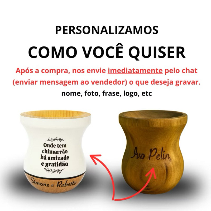 🔴 ENVIE A ARTE APÓS A COMPRA! Caso não seja enviada, o pedido será personalizado apenas com o nome do comprador. 🎯 CUIA DE CHIMARRÃO PERSONALIZADA EXCLUSIVA Transforme o seu mate em um momento único com uma cuia personalizada do seu jeito! ✅ Personalizamos com: – Nome – Profissão – Frase especial ( PEQUENA) – Foto – Brasão de time ou símbolo religioso 📏 Tamanho: Médio tradicional (ideal para uso diário) 🪵 Material: Madeira nobre com revestimento interno 🔥 Detalhes: Acabamento rústico de alta qualidade 🎁 IDEAL PARA PRESENTE: Presenteie alguém especial com uma cuia que carrega história, identidade e estilo! Perfeita para datas comemorativas, aniversários ou como um mimo personalizado. 📸 Após a compra, envie sua arte ou detalhes da personalização pelo chat da Shopee. Nossa equipe entrará em contato se necessário. 🛠️ Produção em até 2 dias úteis 📦 Envio rápido para todo o Brasil OBS: Por se tratar de uma gravação a laser em superfície curva de madeira natural, com ou sem verniz, especialmente em logos com traços finos, pode haver alguns pontos levemente mais escuros ou mais brancos devido ao efeito de microtermorreatividade controlada. Isso não compromete a qualidade e reforça o aspecto artesanal e exclusivo da peça. A personalização (com foto) é feita a partir da foto enviada, porém a gravação não é uma fotografia, e sim uma arte em traços simplificados para ser aplicada a laser na madeira. O resultado é uma representação artística, podendo haver pequenas diferenças de perspectiva e detalhes. Como cada cuia é artesanal em madeira natural, também podem ocorrer variações de peso, tonalidade e veios da madeira.