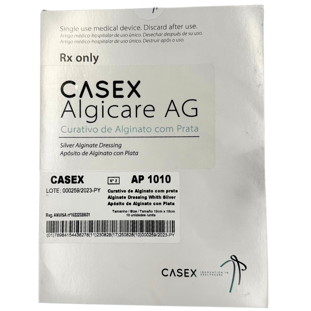 O Curativo Algicare Ap1010 – Casex é um curativo avançado composto por alginato de cálcio, carboximetilcelulose (CMC) e PRATA iônica, desenvolvido para o tratamento eficaz de feridas com moderada a alta exsudação. Sua tecnologia permite a absorção do exsudato, que ao entrar em contato com as fibras de alginato e CMC forma um gel hidrofílico, não aderente, promovendo um ambiente úmido ideal para a cicatrização. Esse mecanismo favorece o desbridamento autolítico, protege o tecido recém-formado e possibilita a remoção do curativo sem trauma ou dor, com mínimo risco de lesão ao leito da ferida. A presença da prata iônica auxilia no controle bacteriano, contribuindo para a redução da carga microbiana, diminuição do risco de infecção e controle de odores, fatores essenciais para a evolução adequada do processo cicatricial. Feridas Infectadas ou com Risco de Infecção: Úlceras (de pressão, venosas, diabéticas), queimaduras, feridas cirúrgicas. Feridas Crônicas e Agudas: Feridas que não cicatrizam bem, com exsudato (líquido) ou odor. Feridas Oncológicas: Feridas que secretam muito líquido.