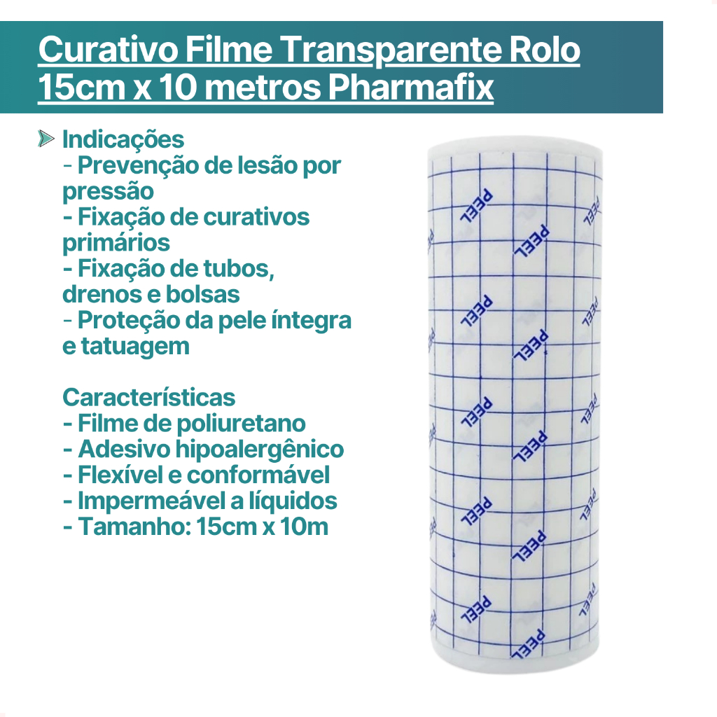 Seja bem-vindo! Curativo Filme Transparente Pharmaplast PU 15cm x 10m O Curativo Filme Transparente Pharmaplást PU é um curativo adesivo à prova d'água, não estéril, revestido com adesivo acrílico hipoalergênico. De fácil aplicação, é altamente flexível, conformável e pode ser recortado no tamanho desejado. Indicações 1. Prevenção de lesão por pressão 2. Fixação de curativos primários 3. Fixação de tubos, drenos e bolsas 4. Proteção da pele íntegra e tatuagem Características 1. Filme de poliuretano 2. Adesivo hipoalergênico 3. Flexível e conformável 4. Impermeável a líquidos 5. Alta taxa de transmissão de vapores úmidos (700g/m²/24hrs) 6. Tamanho: 15cm x 10m Modo de Uso 1. Aplique sobre a pele limpa e seca 2. Recorte no tamanho desejado 3. Retire com cuidado, umedecendo com soro ou água se necessário Especificações Técnicas 1. Registro ANVISA: 81606090002 2. Fabricante: Pharmaplast Quem Somos? Desde 1990 atuamos com foco em licitações públicas para atendimento a hospitais e clínicas médicas do ES. Somos reconhecidos pelos setores público e privado como um dos melhores e mais eficientes distribuidores de produtos hospitalares, afinal, estamos presente nos 78 municípios capixabas, na Secretaria da Saúde Estadual e em mais de 800 clientes da rede privada incluindo também empresas de Remoção, Home Care, Clínicas Odontológicas, Dentais, Distribuidores, Drogarias, Clínicas Veterinárias, dentre outros.