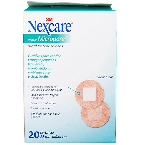 Possuem tecnologia Micropore, que permite que a pele respire Almofada que não adere a ferida Discretos Para ferimentos menores Almofada que não adere à ferida Com almofadas que não aderem à ferida, os Curativos Feitos de Micropore Redondo Nexcare são discretos e desenvolvidos para cobrir e proteger pequenos ferimentos ou regiões pós-injeção especialmente em peles frágeis e sensíveis, promovendo o melhor ambiente para a cicatrização. Com tecnologia Micropore, permitem que a pele respire. Aplicações sugeridas Cobrem e protegem pequenos ferimentos como cortes, arranhões, escoriações e bolhas, ou regiões pós-injeção Tipo de curativo ideal para peles sensíveis e frágeis e para uso prolongado