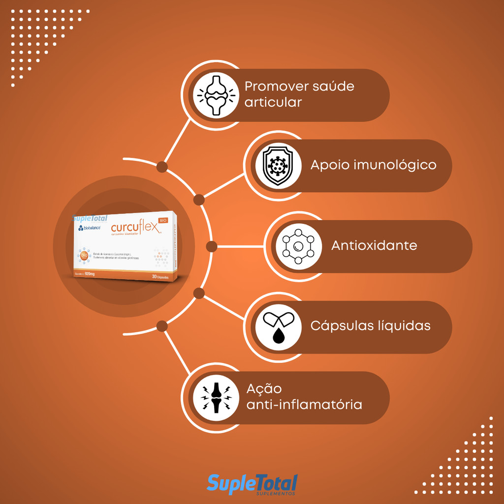 Curcuflex-Bio Aproveite ao máximo os benefícios da curcumina biomicelar em cápsulas líquidas. A curcumina é um composto químico encontrado na cúrcuma, que é uma planta da família do gengibre, nativa do sul da Ásia. A planta cresce em muitas regiões tropicais e é amplamente cultivada na Índia, China, Indonésia e outras partes do sudeste asiático. Utilizada há milênios na culinária e na medicina tradicional, a cúrcuma ganhou destaque por causa da curcumina, seu componente ativo. A curcumina, isolada no século XIX, é muito reconhecida, sendo objeto de pesquisas modernas para compreender seus benefícios à saúde. Assim, a história da cúrcuma e da curcumina é marcada pela longa trajetória na culinária e na medicina tradicional de várias culturas. O aproveitamento da curcumina Estudos indicam que o ingrediente curcumina apresenta uma ação pleitrófica. Os nutrientes do Curcuflex-Bio® apresentam uma ação pleiotrófica, modulando múltiplas vias da sinalização celular e afetando vários alvos moleculares diferentes. Essas atividades estão relacionadas à sua estrutura molecular e características químicas, assim como à sua capacidade de interagir e regular vários componentes de sinalização celular, de maneira direta ou indireta, tais como fatores de transcrição, enzimas, mediadores inflamatórios, proteínas quinases, moléculas de adesão, fatores de crescimento, quimiocinas, proteínas transportadoras, íons metálicos, DNA, RNA entre outros.