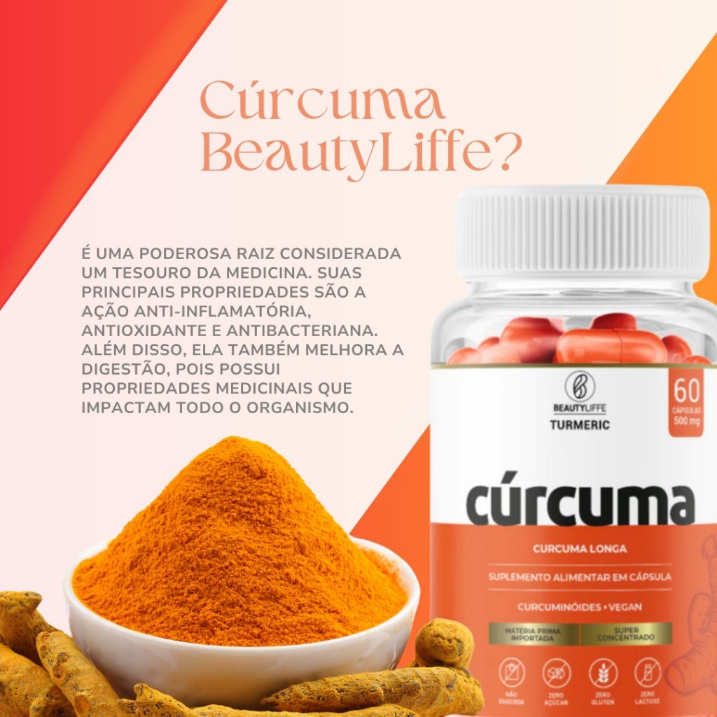 BeautyLiffe Cúrcuma - 120 Cápsulas (kit com 2 unidades de 60 caps) A Cúrcuma é uma especiaria amplamente conhecida por suas propriedades terapêuticas. Em sua forma concentrada em cápsulas, ela oferece uma maneira prática e eficaz de aproveitar seus benefícios para a saúde. ✈️ Matéria Prima Importada 💊SUPER CONCENTRADO - Características do Produto: 🔸 **Quantidade:** 60 cápsulas 500mg 🔸 **Dosagem:** 130mg Curcumina a cada duas cápsulas 🔸 **Composição:** Cúrcumina em pó, cápsula vegetal 🔸 **ZERO: ** ZERO Açúcar, ZERO Lactose, ZERO Glúten (NÃO ENGORDA) - Benefícios: 🔸 **Ação Anti-inflamatória:** A curcumina, principal composto ativo da cúrcuma, possui potente efeito anti-inflamatório, auxiliando no emagrecimento, alívio de dores articulares e musculares. 🔸 **Antioxidante:** Protege as células do corpo contra danos causados por radicais livres, contribuindo para o envelhecimento saudável. 🔸 **Saúde Digestiva:** Melhora o processo digestivo, aliviando desconfortos como gases e inchaço. 🔸 **Apoio à Imunidade:** Fortalece o sistema imunológico, ajudando a combater infecções e doenças. 🔸 **Ação Detox:** Auxilia na eliminação de toxinas do organismo, promovendo uma desintoxicação natural. -Modo de Uso: Tomar 2 cápsulas, 1 a 2 vezes ao dia nas principais refeições, ou conforme recomendação de um profissional de saúde. **Indicado para:** Pessoas que buscam melhorar a saúde das articulações, fortalecer o sistema imunológico, melhorar a digestão e combater os efeitos do envelhecimento celular. ⚠️**Atenção:** Consulte um médico, especialmente se estiver grávida, amamentando ou tomando medicamentos. **Invista na sua saúde com a BeautyLiffe Cúrcuma!**
