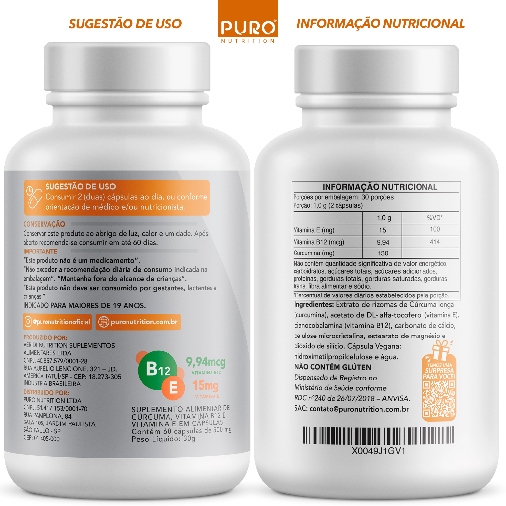 Cúrcuma em Cápsulas Puro Nutrition com Vitamina B12 + Vitamina E, 130mg Cúrcuma Longa 60 Cáps Vegano