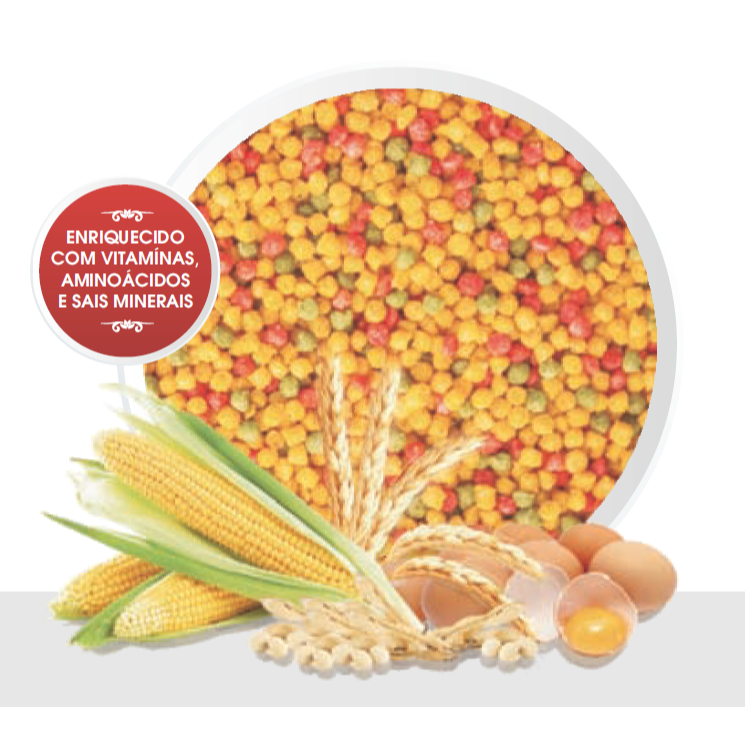 Alimento completo para pássaros, enriquecido com vitaminas, aminoácidos e sais minerais. Desenvolvido com proteínas de alto valor biológico, enzimas, probióticos e prebiótico, especialmente para pássaros de médio porte, tais como: Curiós, Bicudos e Azulões. Recomenda-se que o Alimento Biotron Curió, Bicudo e Azulão seja introduzido na dieta dos pássaros de maneira gradativa, misturando- o às sementes ou demais alimentos utilizados costumeiramente. Assim, evita-se o estresse pela mudança brusca da alimentação. Para se obter um bom equilíbrio nutricional, recomenda-se que pelo menos 50% da alimentação dos pássaros seja constituída pelo Alimento Biotron Curió, Bicudo e Azulão. Descrição Indicação do produto: Alimento completo para pássaros, enriquecido com vitaminas, aminoácidos e sais minerais. Desenvolvido com proteínas de alto valor biológico, enzimas, probióticos e prebiótico, especialmente para pássaros de médio porte, tais como: Curiós, Bicudos e Azulões. Recomenda-se que o Alimento Biotron Curió, Bicudo e Azulão seja introduzido na dieta dos pássaros de maneira gradativa, misturando- o às sementes ou demais alimentos utilizados costumeiramente. Assim, evita-se o estresse pela mudança brusca da alimentação. Para se obter um bom equilíbrio nutricional, recomenda-se que pelo menos 50% da alimentação dos pássaros seja constituída pelo Alimento Biotron Curió, Bicudo e Azulão. Modo de usar: Pode ser utilizado puro, à vontade ou misturado com os demais alimentos utilizados costumeiramente. Conservação: Deve ser conservado em local seco, sobre estrados e protegida da luz solar. Composição básica do produto: Milho*, Soja Integral Extrusada*, Farelo de Soja*, Óleo de Soja Refinado*, Sal Comum(Cloreto de Sódio), Aromatizante, Aditivo Probiótico, Fosfato Bicalcico, Calcário Calcítico, Corante Amarelo Tartrazina, Corante Vermelho Ponceau, Corante Amarelo Crupusculo, Corante Azul Indigotina N2, DL-Metionina, L-Lisina, Cloreto de Colina, Proteinato de Cobre, Óxido de Manganês, Iodato de Cálcio, Óxido de Zinco, Tripicolinato de Cromo, Selênio Levedura, Proteinato de Zinco, Vitamina A, Vitamina E, Vitamina D3, Vitamina K3, Vitamina B1, Vitamina B2, Vitamina B6, Vitamina B12, Niacina, Ácido Fólico, Biotina, Pantotenato de Cálcio, Vitamina C, Caulim, Etoxiquim e Hidróxido de Anizola Butilato (B.H.A.). Eventuais substitutivos: Quirera de Arroz, Óleo de Soja*, Farinha de Carne, Farelo de Glúten de Milho, Gordura Vegetal, Farinha de Visceras, Gordura Animal e Óleo de Soja Degomado*. Espécies de microorganismos doadores de genes: *-Bacillus Thuringiensis*- Agrobacterium Tumefaciens*- Streptomyces Viridochromogenes. Restrições e outras recomendações: Uso proibido na alimentação de ruminantes.