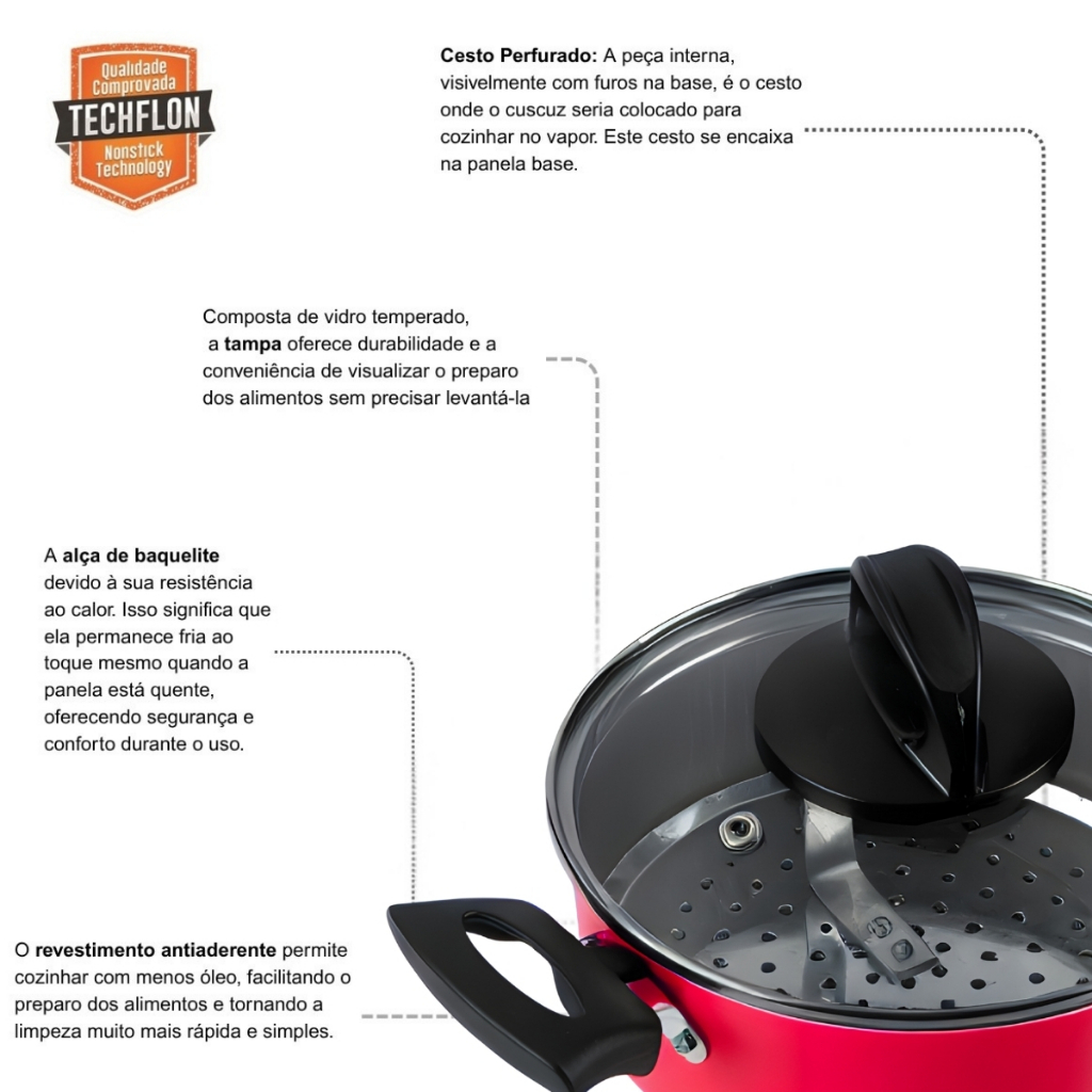 Cuscuzeira Antiaderente Tampa Vidro 16Cm Vermelho Nacional