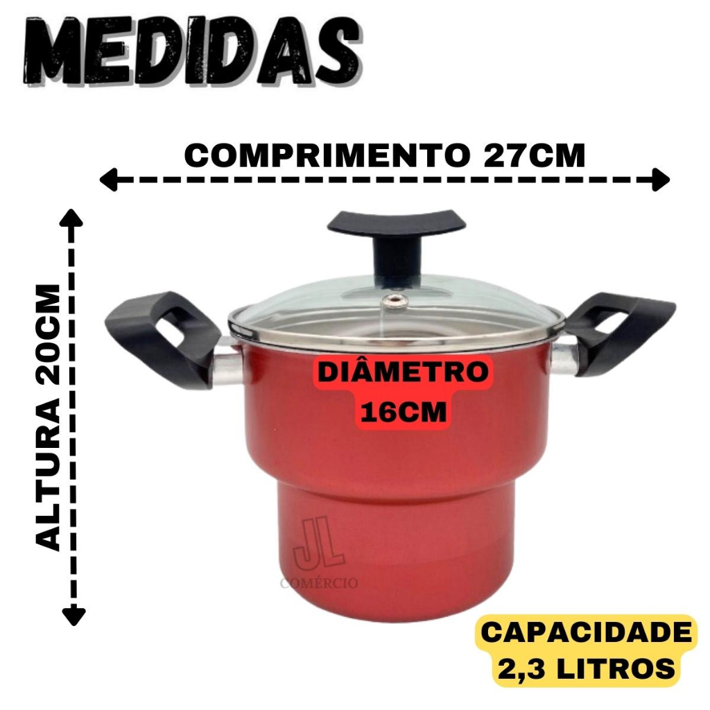 Cuscuzeira Antiaderente Vermelha com Interna Dourada ou Preta Com Tampa de Vidro O cuscuzeiro mais bonito e charmoso, sucesso em todo Brasil, ideal para preparar cuscuz e legumes no vapor, facilidade na limpeza com sua Superficie Antiaderente de ótima qualidade, não precisa se preocupar que os alimentos grudem. não precisa se preocupar que os alimentos grudem. Você e sua família merecem o melhor!! Produto produzido em alumínio laminado, com revestimento interno e externo em antiaderente, Testado e Certificado Pelo Inmetro com Selo Nota A Suas Alças em baquelite (não esquenta), Tampa em vidro com pegador em baquelite. Dimensões: Altura Com Tampa: 20 cm Altura Sem Tampa: 14 cm Diâmetro: 16 cm Largura com as alças: 27 cm Capacidade: 2,3L Cor: Vermelha ( Com Interna Dourada) ou Preta