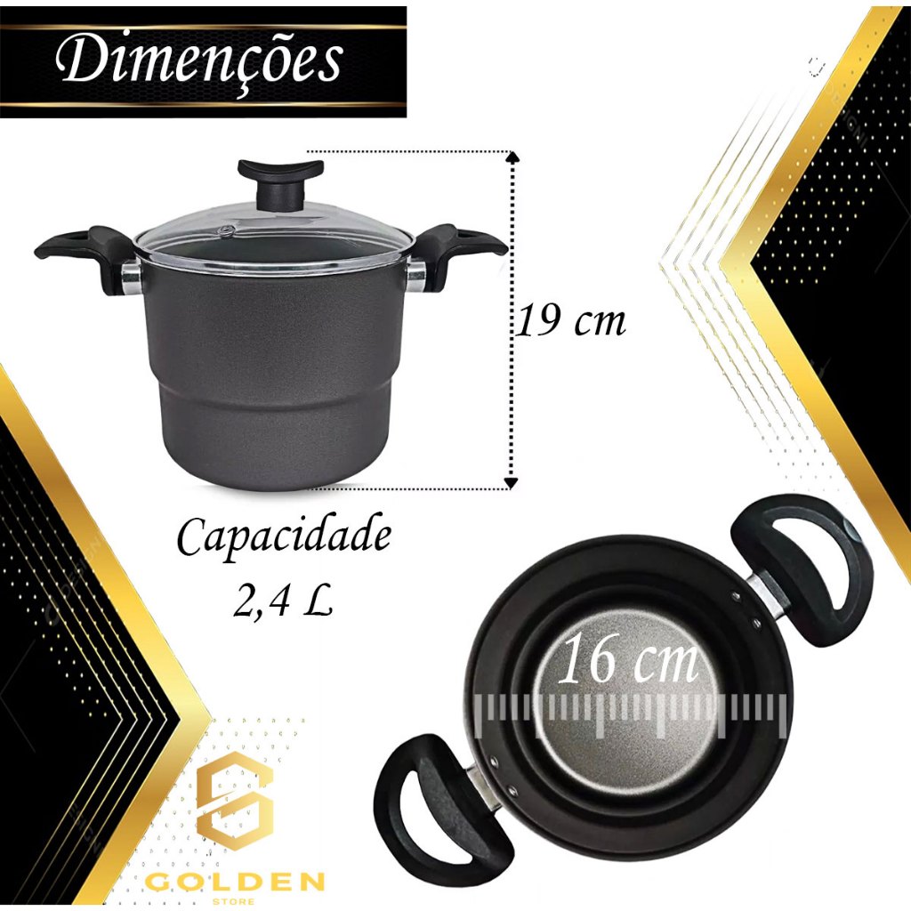 Golden Store O toque de ouro que sua cozinha merece! Cuscuzeiro 16 cm Antiaderente, com tampa de vidro temperado, possui saída para vapor, o que permite visualizar o processo de cozimento. O diferencial desse Item, está em seu material, alumínio de alta qualidade, espessura de 1,1 mm, que confere ao item uma estrutura resistente garantindo a durabilidade e distribuição eficiente do calor, proporcionando o cozimento mais rápido e uniforme dos alimentos. Revestido com 5 camadas de antiaderente TEFLON (DuPont) - PFOA Free, internamente e externamente, evitando que o alimento grude na superfície, o que possibilita o preparo dos alimentos com menos gordura, além de proporcionar praticidade no momento da limpeza. Possui cabo reforçado ergonômico, feito em baquelite, material antitérmico que não retém calor, para garantir facilidade e máxima segurança no manuseio. Especificações Técnicas: Dimensões aproximadas - cm: (A x L x C – Capacidade volume): - 1 Cuscuzeiro 16 cm de diâmetro – 13 x 16 x 28 – Total 2,4 L Sendo: (em baixo p/água capacidade 1L) e (em cima p/ cuscuz capacidade 1.400 L) Material: Alumínio Revestido Revestimento Externo: Antiaderente Revestimento Interno: Antiaderente Espessura Material: 1,1mm Tampa: Tampa de Vidro Temperado Alça: Baquelite Peso - Cuscuzeira c/ a tampa e ralo: 608 g Dimensões aproximadas da embalagem (AxLxP): (14 x 18 x 14) cm Recomendações: Antes do primeiro uso é necessário realizar a limpeza e a cura do item, imprescindível para durabilidade e proteção da camada antiaderente. Lave com esponja macia e detergente neutro, seque-a com um pano limpo. Unte a parte interna com óleo ou outra gordura e leve-a ao fogo baixo por 2 minuto. Deixe-a esfriar, lave, enxugue e está pronta para utilizar. Cuidados: - Para conservação e durabilidade do seu produto lavar somente om lado macio da esponja; - Evite a imersão do produto quente em água fria. Sempre o deixe esfriar antes de lavar; - Para mexer os alimentos use somente utensílios de silicone ou nylon; - Não exponha as alças e cabos diretamente ao fogo ou fonte de calor prolongado; - Não pode ser levada ao forno e/ou microondas; - Mantenha o produto sobre a chama do fogão apenas o necessário para o cozimento, sempre em fogo baixo ou médio (nunca superior a 350°C). Detalhes: - Garantia 30 dias contra defeitos de fabricação) - Itens decorativos não acompanham o produto. Imagens meramente ilustrativas