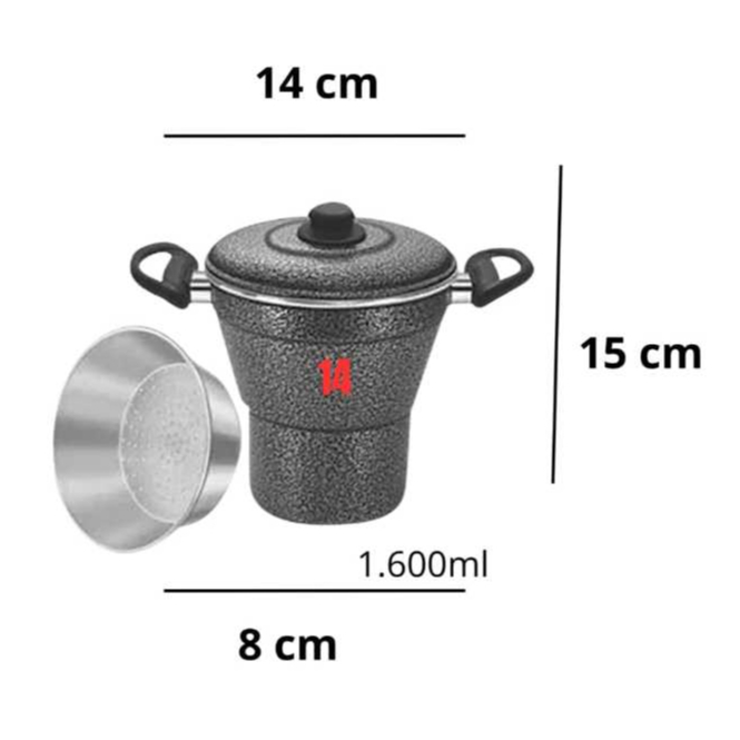 Cuscuzeira de Alumínio com cesto – Pronta Entrega Prepare um delicioso cuscuz de maneira prática e rápida com essa cuscuzeira de alumínio resistente e durável! Ideal para o dia a dia, ela vem com tampa, alças laterais resistentes e um cesto que além de ser usado para o cozimento do próprio cuscuz você pode cozinhar legumes a vapor, perfeita para quem busca praticidade na cozinha. Características: • Material: Alumínio resistente • Alças laterais de alta qualidade, que facilitam o manuseio • Design moderno • Compatível com fogão a gás Vantagens: • Produto novo e original • Enviamos em até 24 horas • Pronta entrega • Qualidade garantida TAMANHOS E DIMENSÕES CUSCUZEIRO: Nº14: D 14,0 cm x A 15,0 cm x Esp 0,9 mm- 1,600L CUSCUZEIRO: Nº16: D 15,8 cm x A 17,0cm x Esp 0,9 mm - 2,700L CUSCUZEIRO: Nº18: D 17,7 cm x A 18,5 cm x Esp 1,0 mm - 3,300L CUSCUZEIRO: Nº20: D 19,7 cm x A 20,0 cm x Esp 1,0 mm - 4,100L Ideal para preparar cuscuz nordestino de forma simples, rápida e saborosa! Aproveite e garanta já a sua!